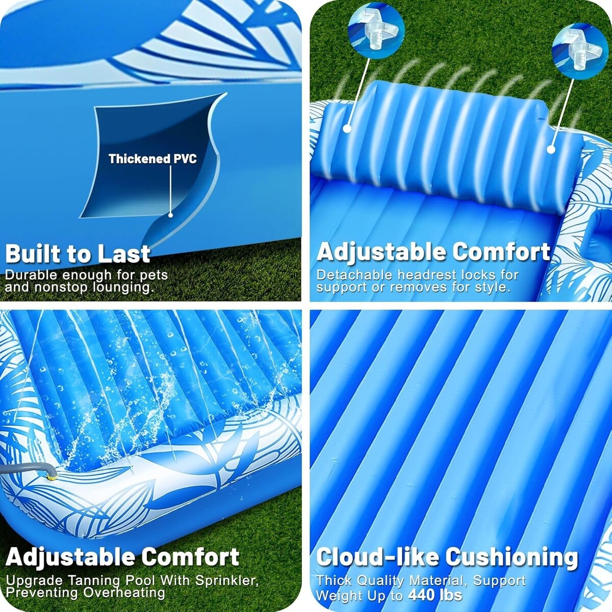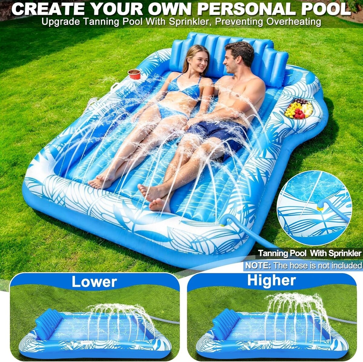 Upgraded Tanning Pool with Sprinkler Function: Simply connect to a water source for continuous refreshment, making your sunbathing sessions cooler and more enjoyable.