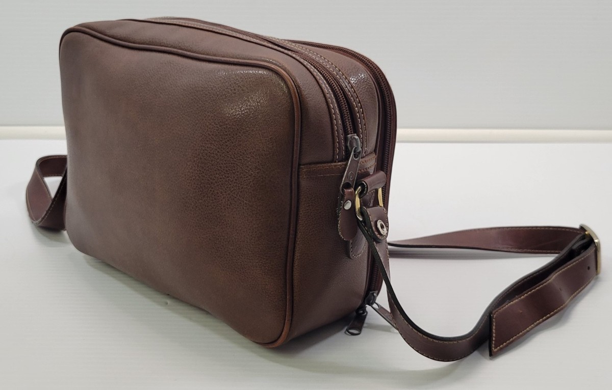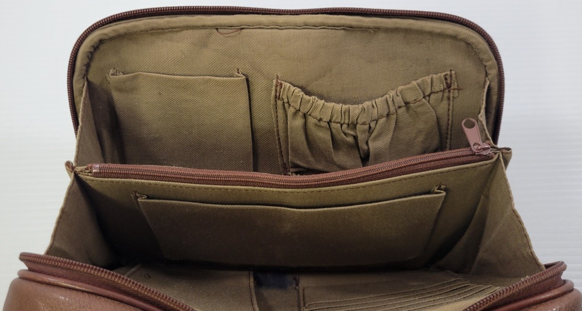 Bag is in fairly good vintage used condition. The inner lining has some marks of age and use. The outside is in better condition and overall good shape. There is a one strip of the outer pocket closure missing with some remaining glue residue.