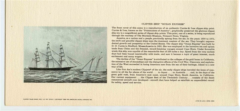 A menu COVER from Pan American World Airways . In very fine condition, measures about 12 1/2" x 10" when closed. On the cover is the Clipper Ship Ocean Express. By Currier and Ives. These were used in the late 1960's and early 1970's. Has information on the Currier and Ives print,on the ship in the print and on the routes of Pan American on the back cover. Would look great when framed