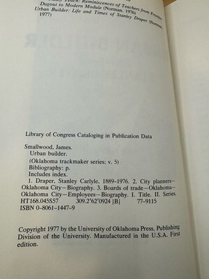 For sale is a first edition of *Urban Builder: The Life and Times of Stanley Draper* by James M. Smallwood, published in 1977. This book is part of the Oklahoma Trackmaker Series (Volume 5) and was published for the Oklahoma Heritage Association by the University of Oklahoma Press.