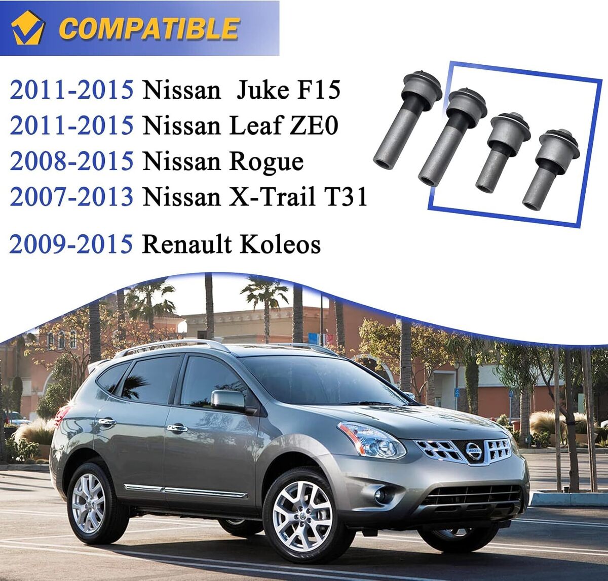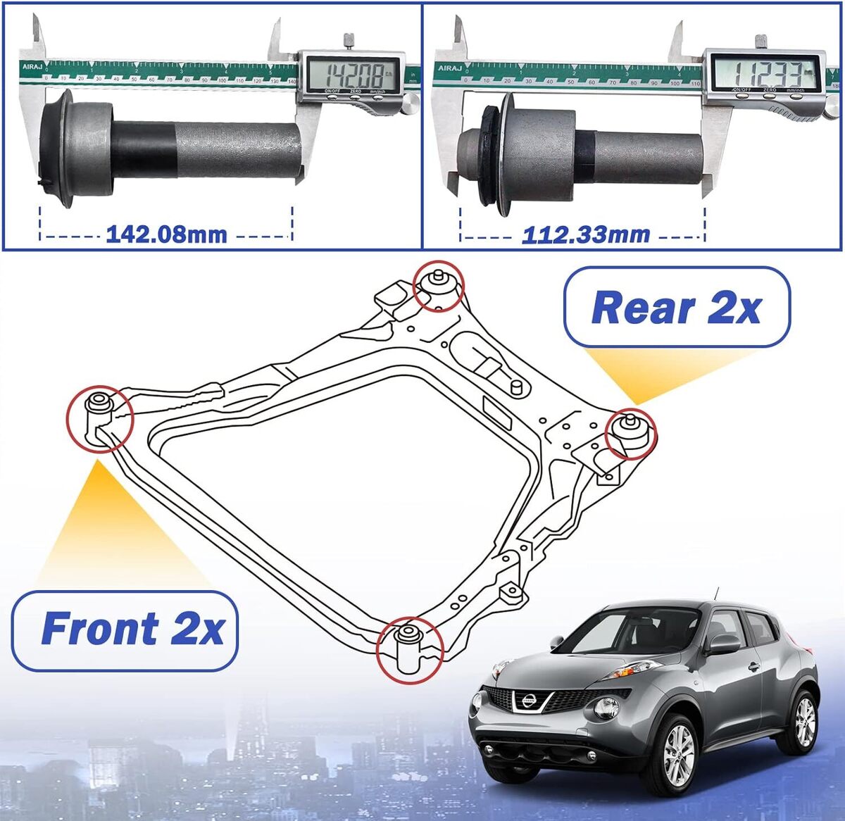 ?OE# 523-305 523-306. Replace OE# 54466-JD000 54467BR00A. Package Included: Front Bushing x2, Rear Bushing x2. ?Compatible with: For 2011-2015 Nissan Juke F15?2011-2015 Nissan Leaf ZE0?2008-2015 Nissan Rogue?2007-2013 Nissan X-Trail T31. For 2009-2015 Renault Koleos. Please check your vehicle in the Amazon Fitment Filter System in the top left corner. Compatibility information provided is for reference only. Please make sure to match the exact part numbers between this part and the part that you are replacing. ?Good Value: Bushings are direct replace, directly fix the loose of vehicle subframe problem, easy install to save your time and money! This bushing repair kit replaces only the worn bushings while retaining the original subframe assembly. ?High-Quality: Manufactured from top materials, this is your best option and inexpensive replacement compatiable with your rebuild, repair, and maintenance needs - an OE replacement product compatiable eith your damaged or aged factory part. ?After-Sales Service: We offer 24 hours customer service and 1 year product service, If you are encounter product installation, product quality and other problems, please feel free to contact us.