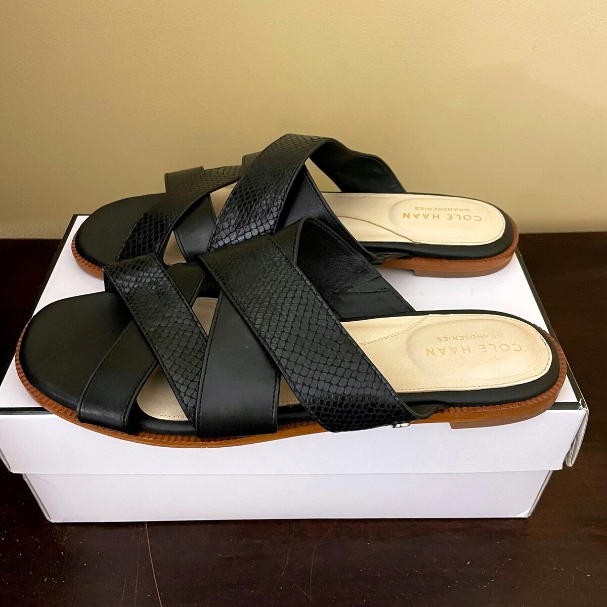 Cole Haan Grandseries Black Leather Snakeskin Embossed Slide Sandals W22956 9.5B