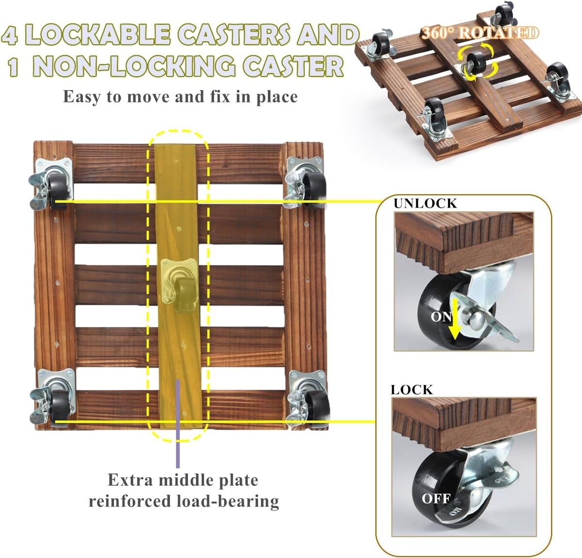 360 Lockable Casters: Featuring 5 heavy-duty casters that allow for smooth mobility and rotating 360, moving your plants around has never been easier. Lockable wheels ensure stability, keeping your plants securely in place.