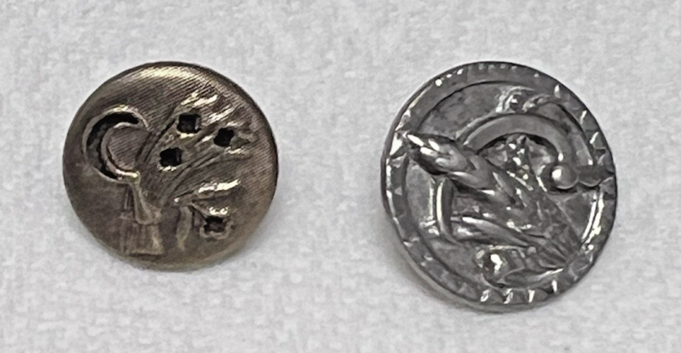 2 Antique Round Metal Dress Buttons Sickles w Wheat Grain Silver Gold Flasher