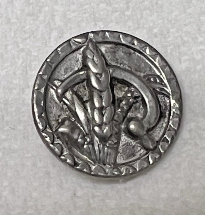 2 Antique Round Metal Dress Buttons Sickles w Wheat Grain Silver & Gold Flasher