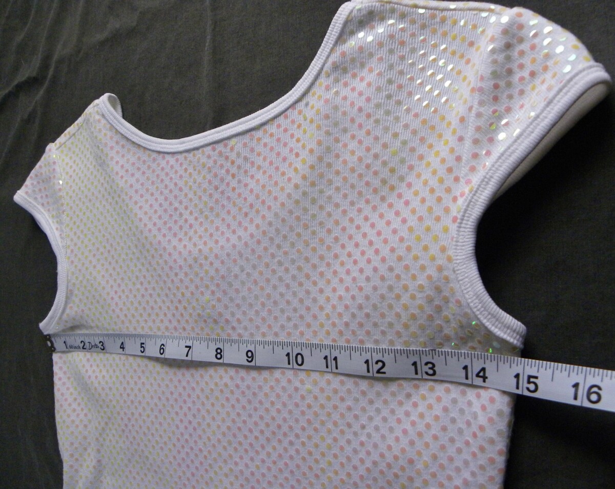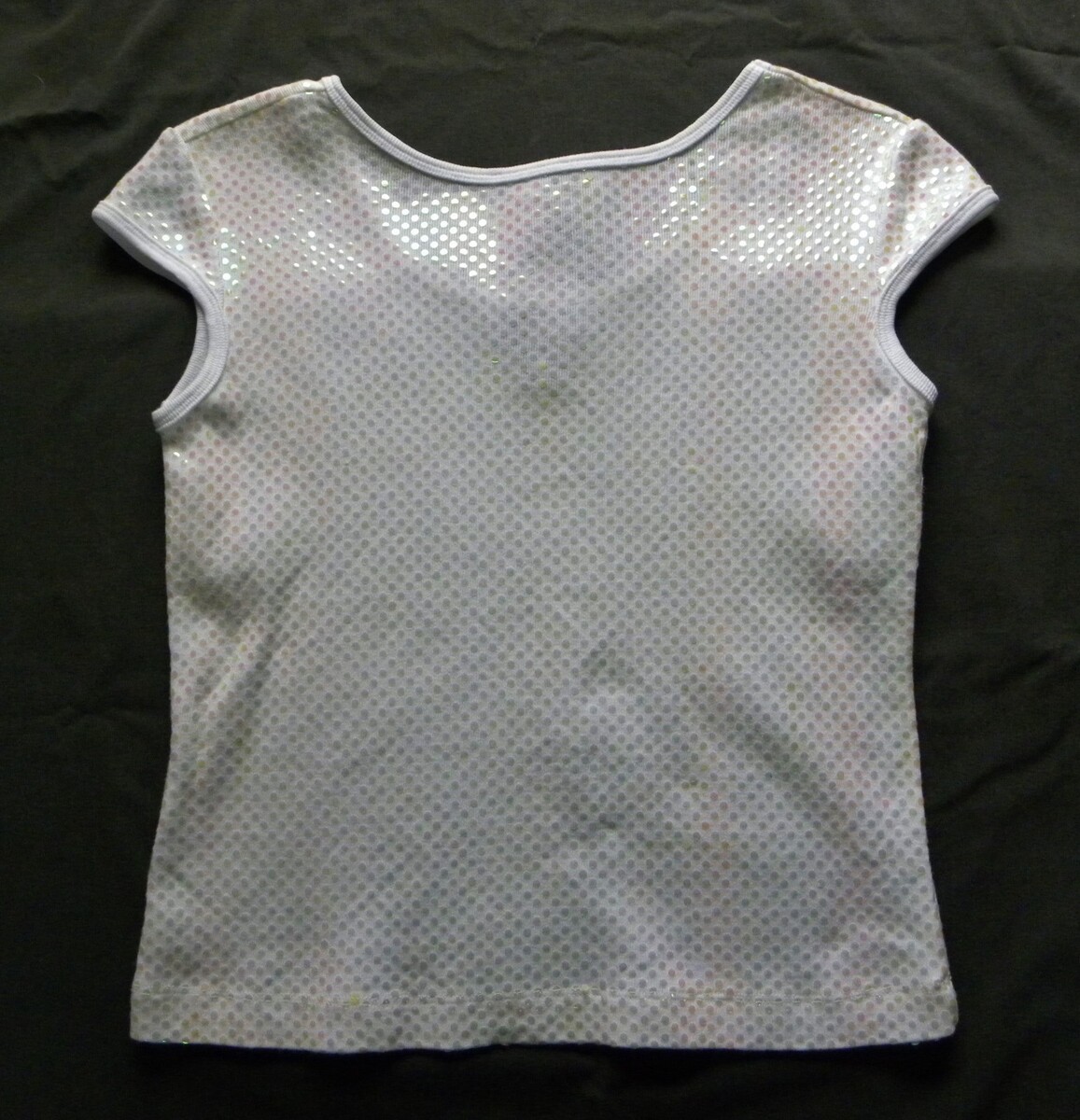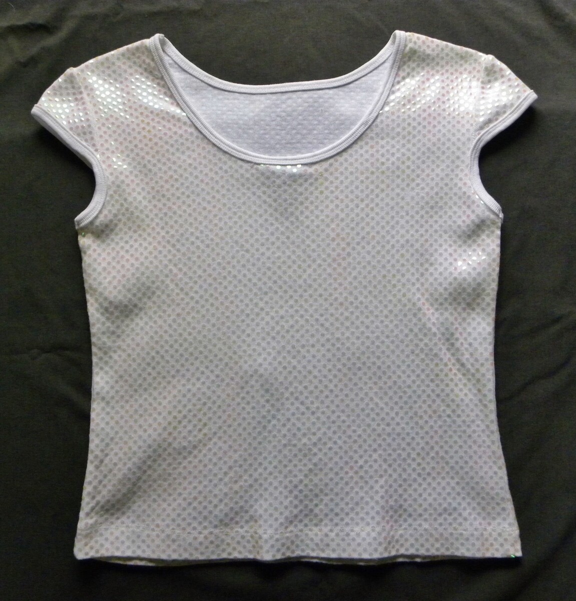 This listing is for a 90s Vintage Capped Sleeve White Shirt by Limited Too in Girls size 14. This shirt has a BOAT-NECKed front and a Scoop-necked Rear. It has glamourous iridescent seguin dots covering it. Fabric:100% Cotton with synthetic sequin dots. Made in Russia Measurements: Chest: 30.5".~~Rear length: 18.5".