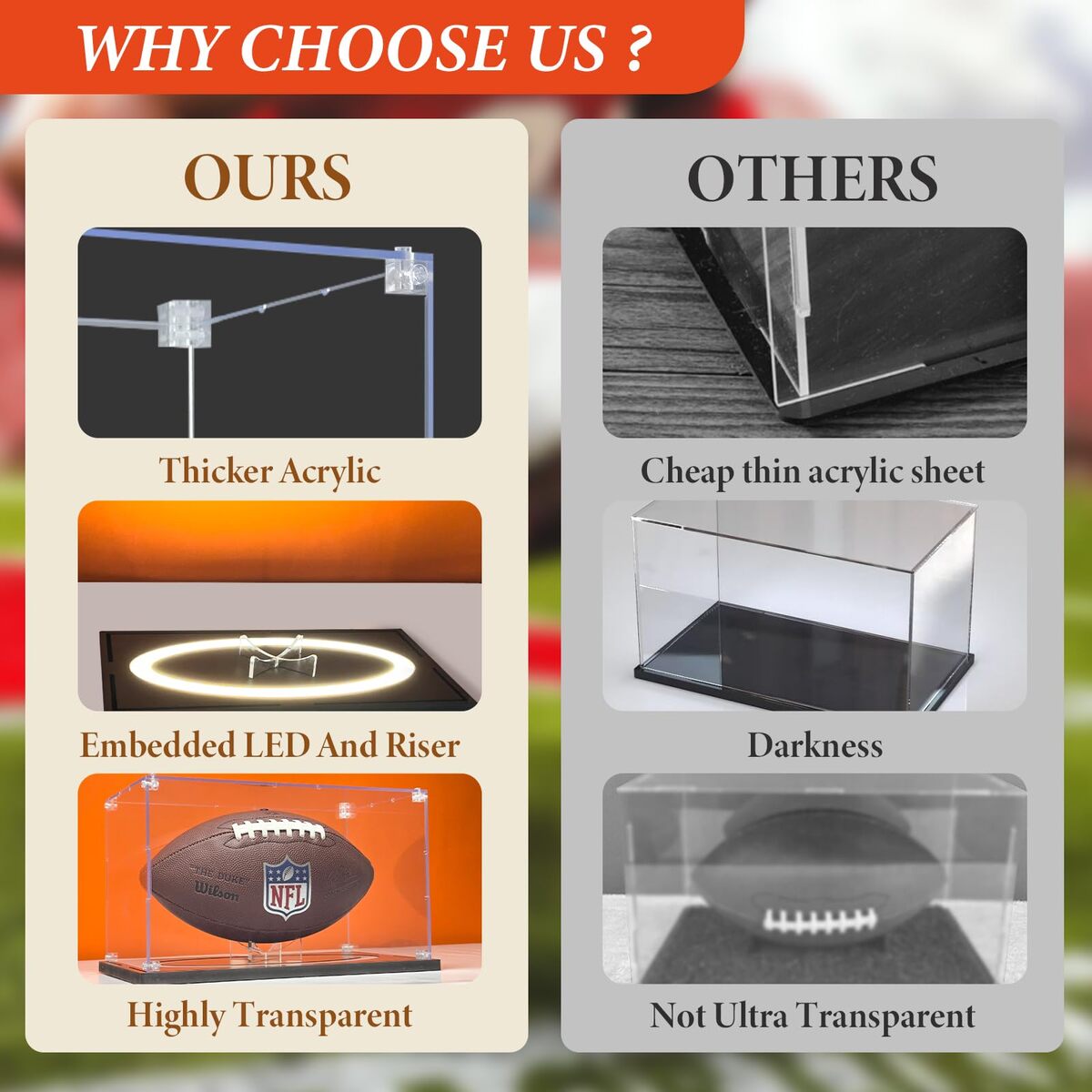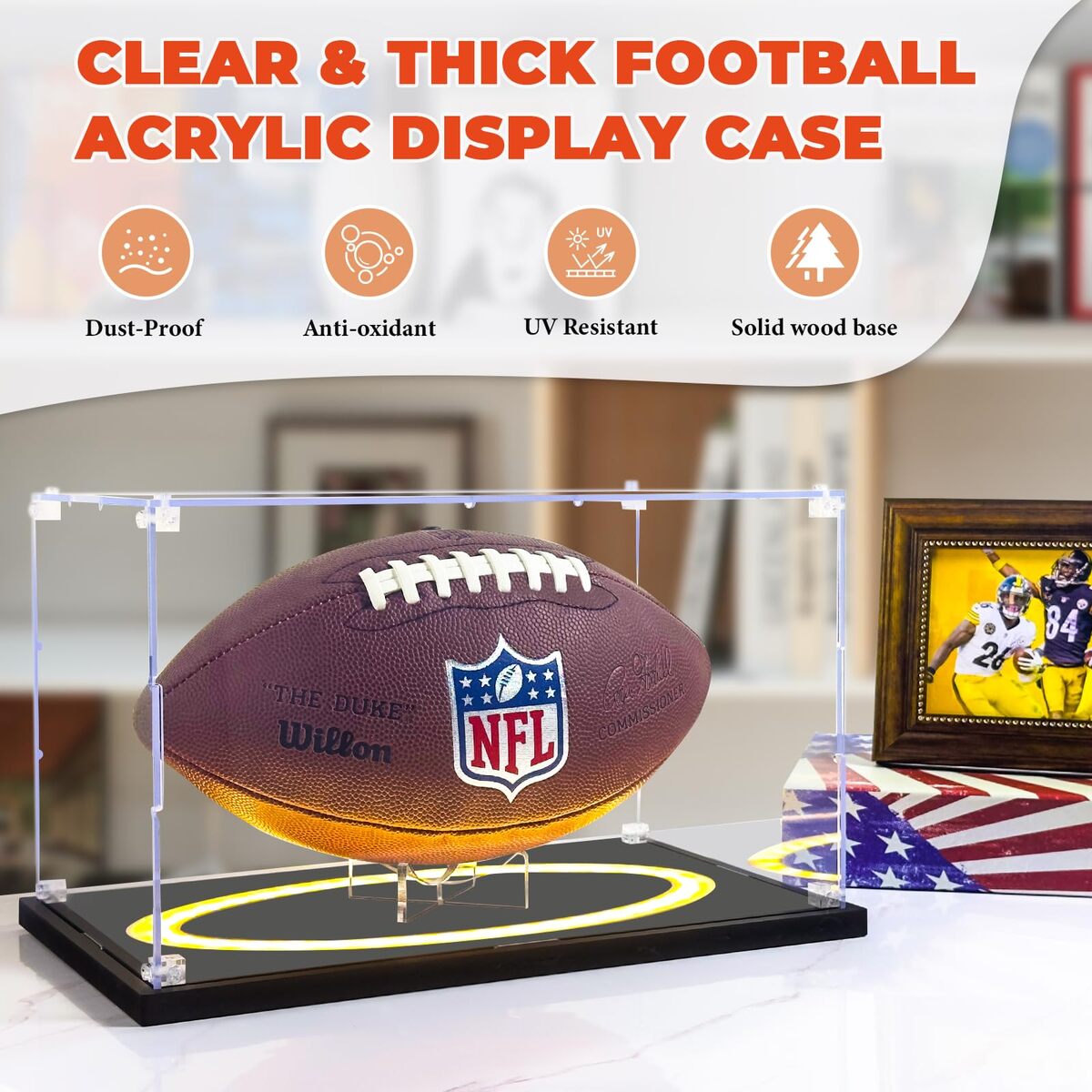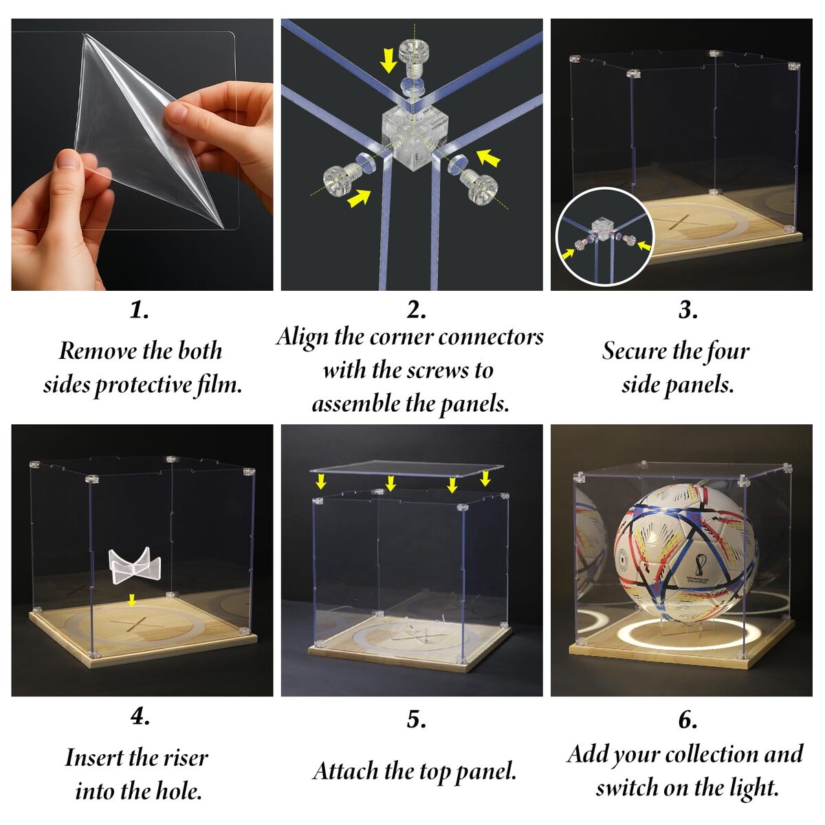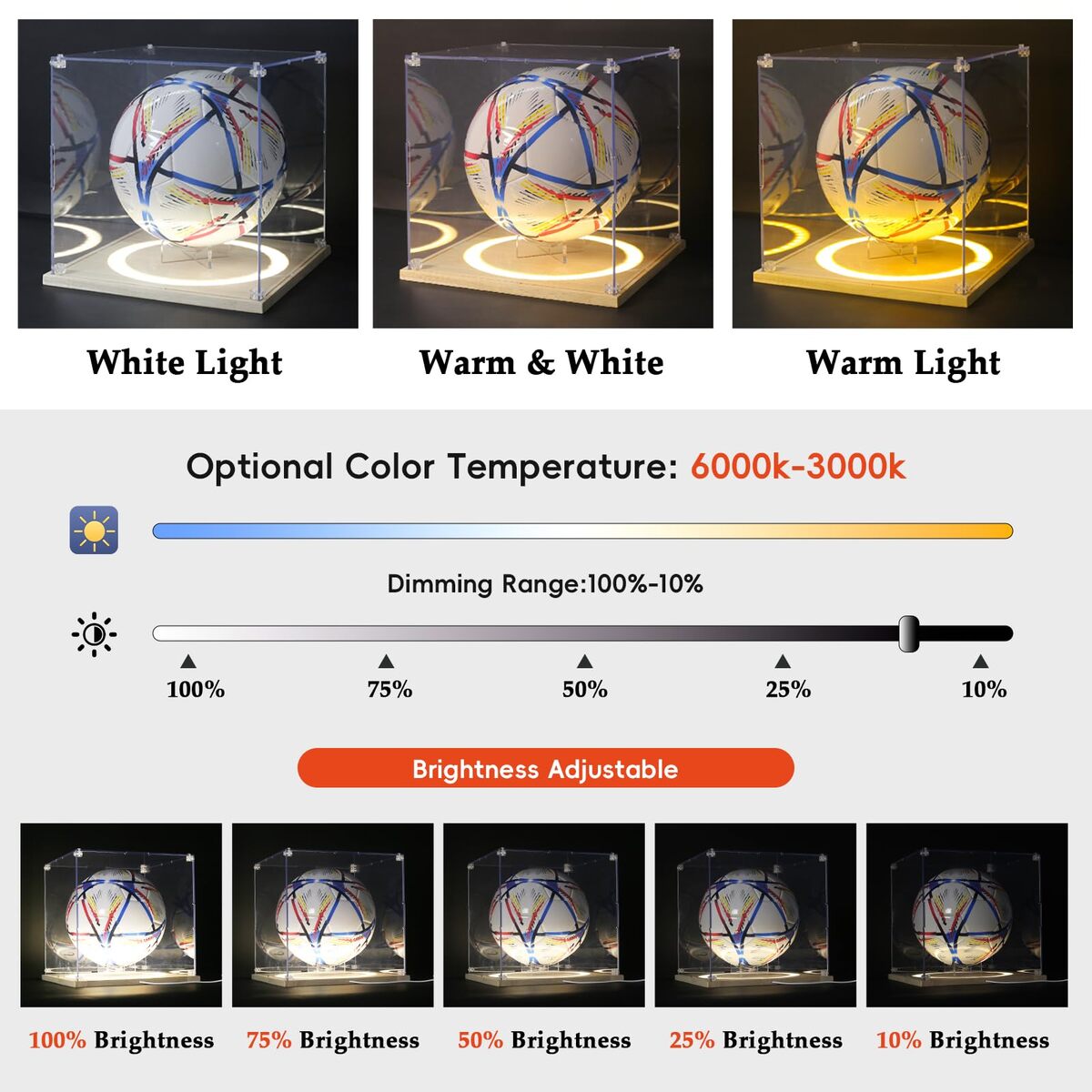Fits For Footballs of All Sizes: This football display case has a full-size of 13*7.9*7.9 inch, perfectly fits various official sizes of football. Built in removable stand ,also allows you to display other suitable collection, such as handmade items, toys, car models, etc.,360All-round Display: The fusion of a sturdy wooden base and transparent acrylic cover to provide clear and long-lasting protection, stylish and safe. Keeps your football dust-free and helps prevent fading from sunlight.,Brilliant LED Lighting: Features three lighting modes?warm, natural, and cool white, with adjustable brightness to highlight your football any time of day.,Easy Assembly: Adopting a screw-fixed structure, sturdy and durable for your collection. The package includes screwdriver and a bag of matching screws for you to install the football display box. Please assemble according to the instructions. If you encounter difficulties during assembly, you can contact us.,Professional Design: Every detail has been carefully considered so as to ensure that the display box fits perfectly with the football and showcases your collection .The clean, modern design blends seamlessly with home, office, or exhibition hall.