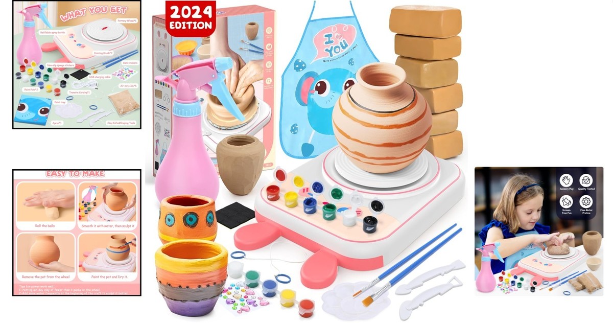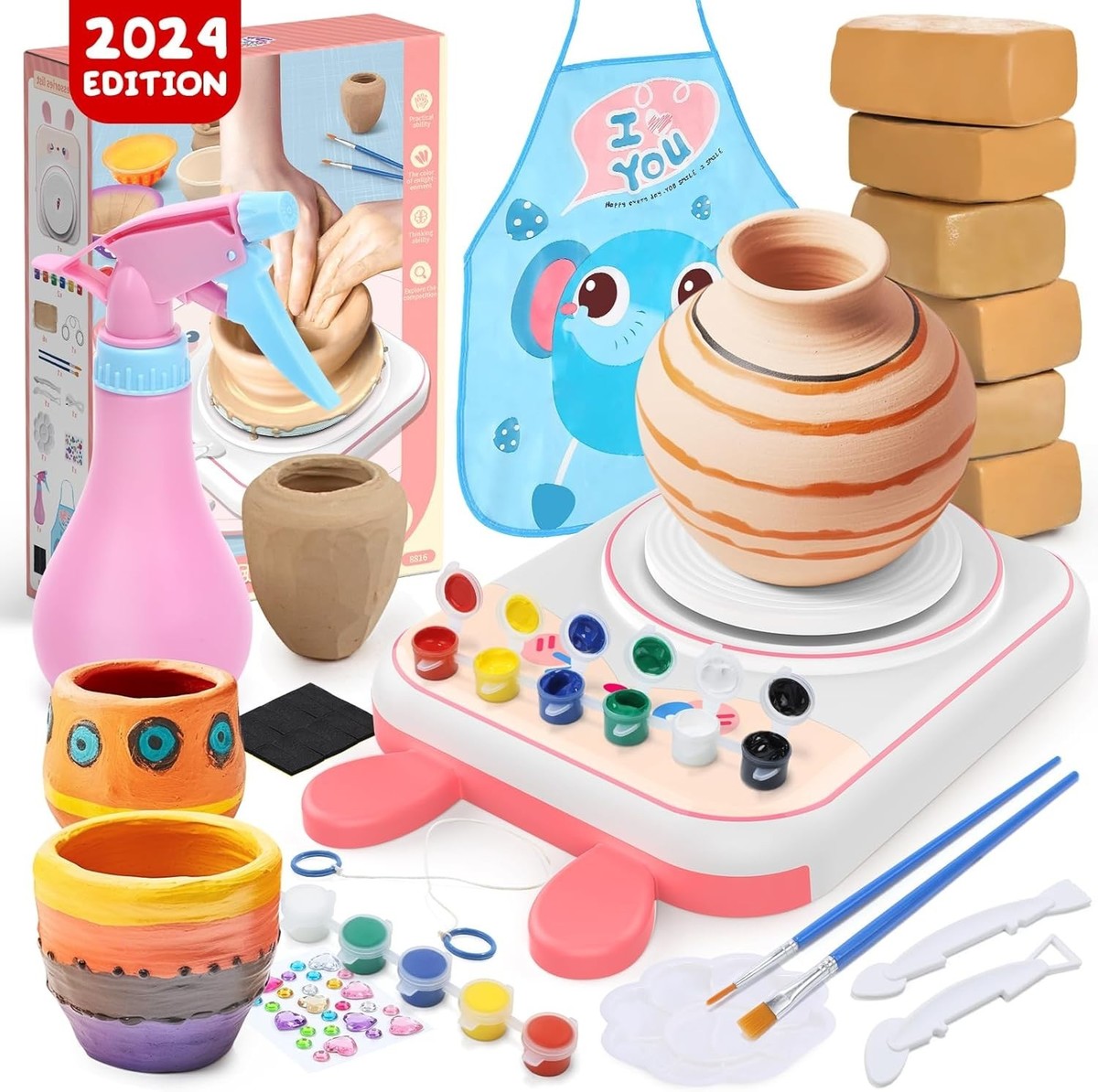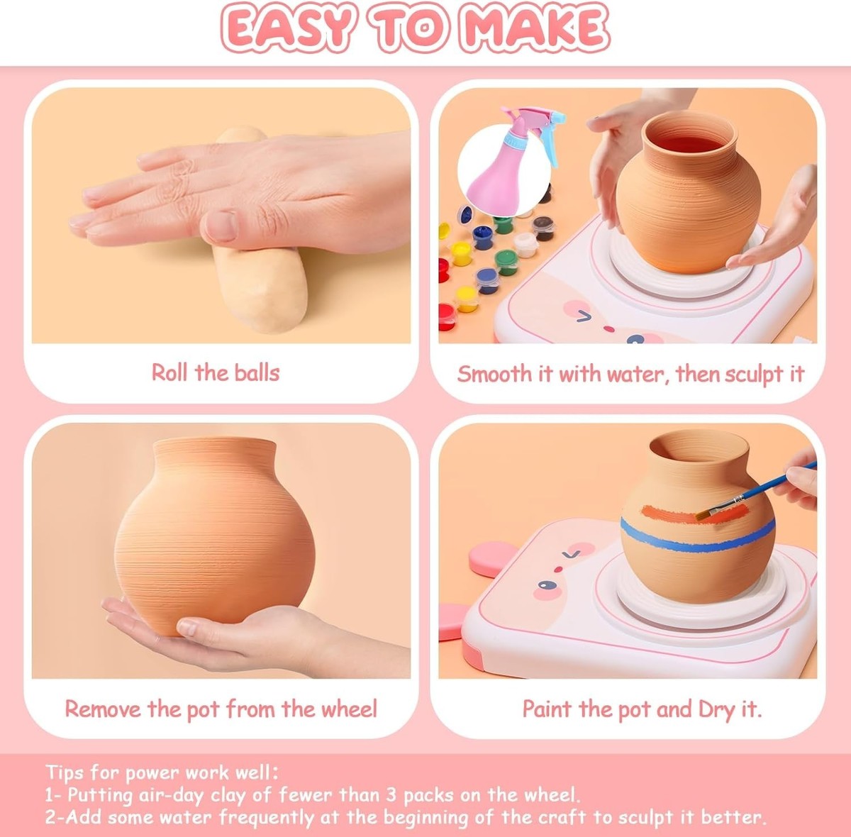 Complete Kit: Includes 1 pottery wheel, 6 air dry clays, 1 refillable spray bottle, 2 painting brushes, 2 painting kits, 1 painting tray, 1 transite cording, 1 USB charging cable, 1 non-slip sponge sticker, 1 gem sticker, 1 apron, and 2 clay knife shaping tools.