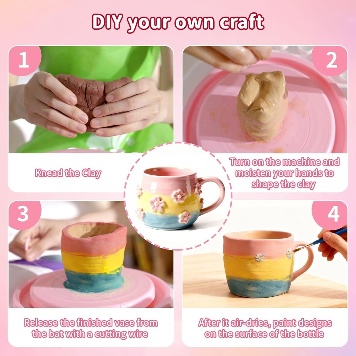 Complete Craft Kit: Includes a mini pottery wheel, 6 packs of colorful clay in 3 delightful shades, and an easy-to-clean wheel.