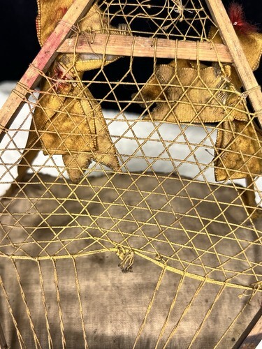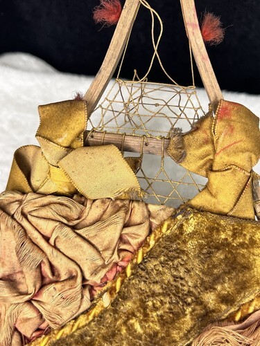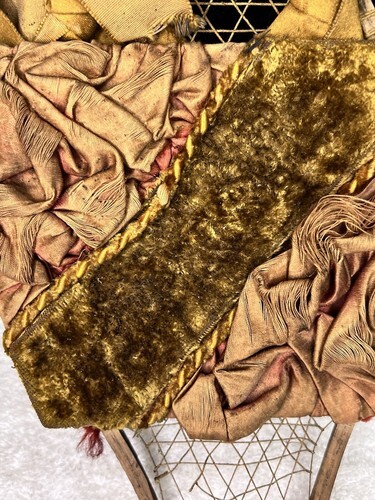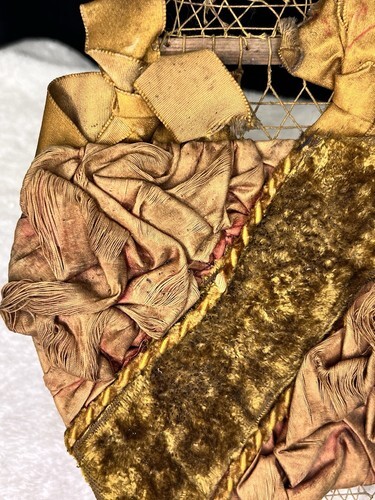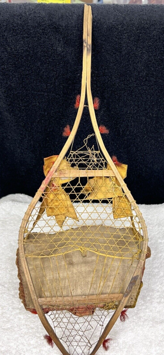 Victorian Small Snowshoe w Silk Velvet Mail Holder Wall Hanger Original The silk ruffles are faded and worn same with the velvet some stings on the snowshoe are tangled still it's quite wonderful it is 17 inches long 6 1/4 wide and the mail holder folds out 3.5 inches. Sold as found so please see all the photos it is delicate so we will take care in the shipping