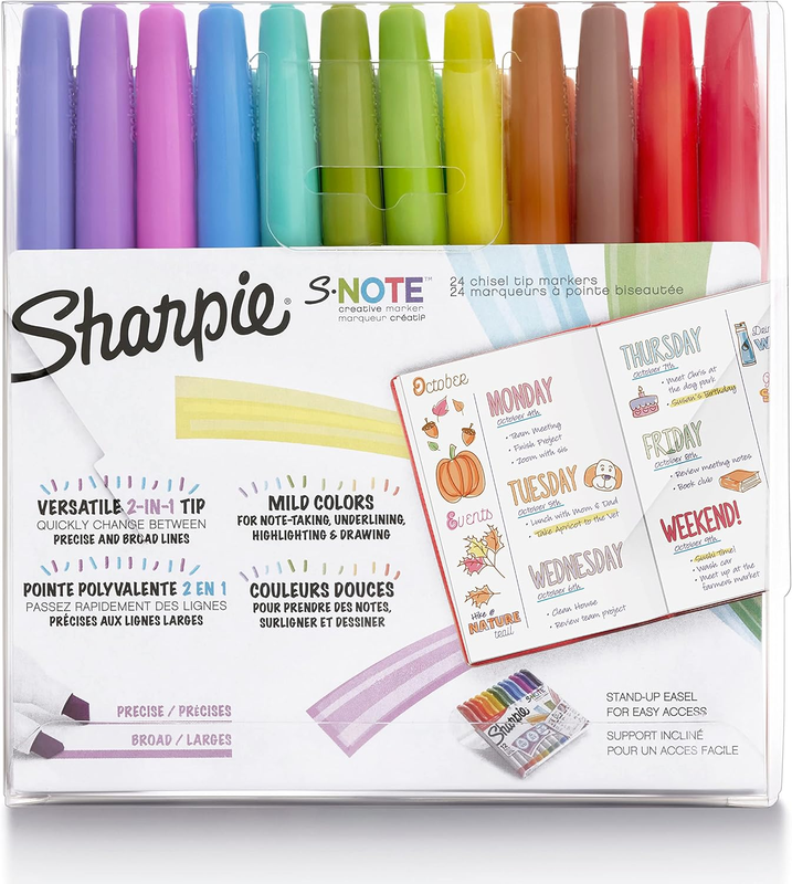 Ignite your imagination with Sharpie S-Note creative markers. Versatile and fun, they?re both a marker and a highlighter, adding a splash of color to note-taking, underlining, highlighting, drawing and more. Versatility is the name of the game with a chisel tip that lets you quickly switch between precise and broad lines. Plus, the no-bleed ink keeps your work looking clean. Unleash your creativity with Sharpie S-Note