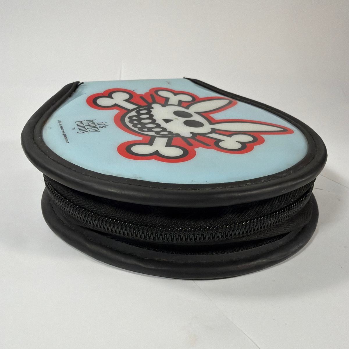 Vintage It?s Happy Bunny (Jim Benton) zippered CD/DVD storage case (2004). Pre-owned with light scuffs/marks and some edge wear; there may be minor spots from use. Includes the case with disc sleeves only?no discs included.