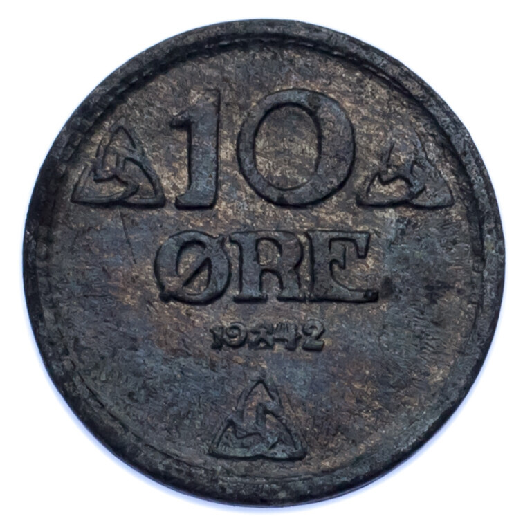 1942 Norway 10 Ore, Almost Uncirculated (AU), KM#389, zinc (50,387,600)