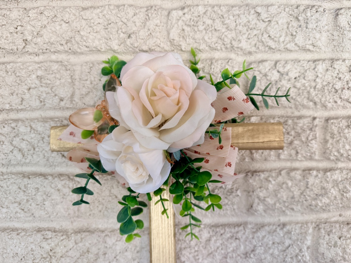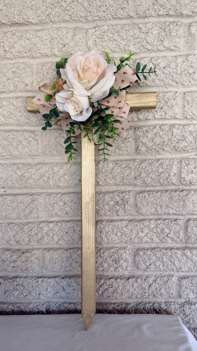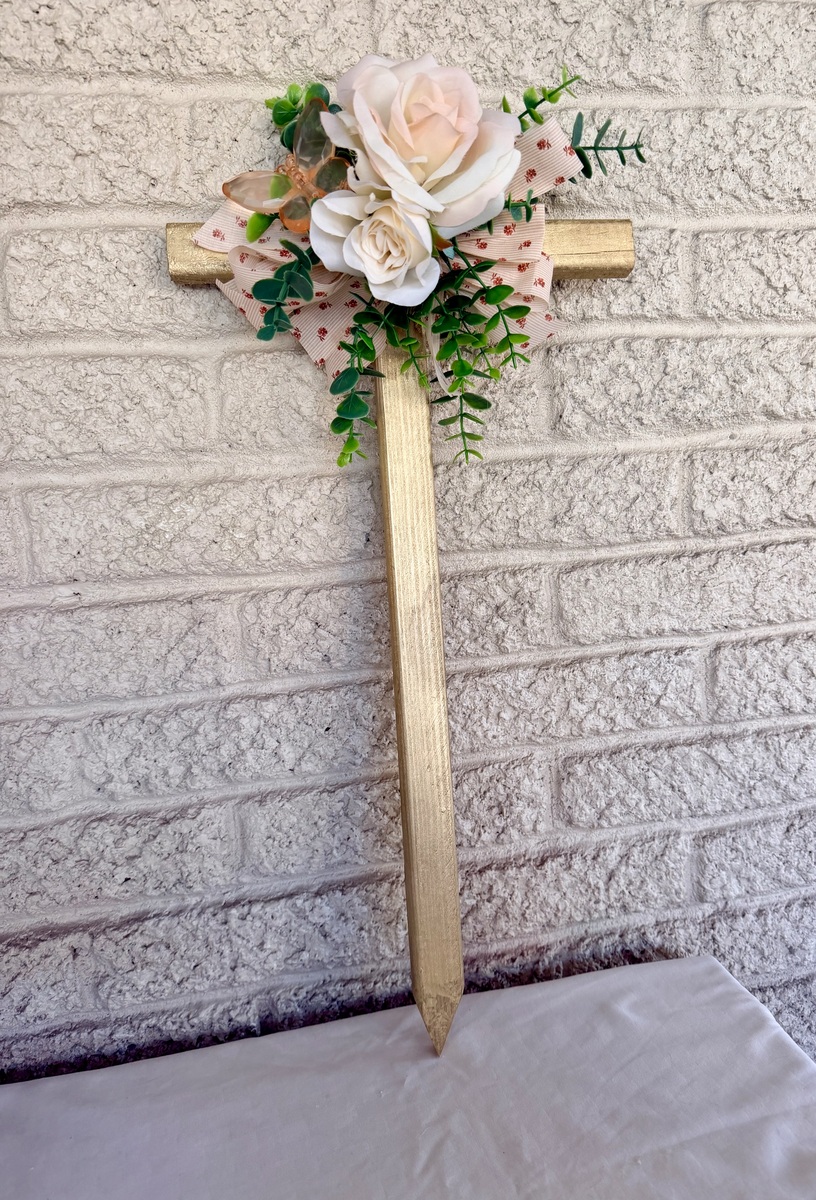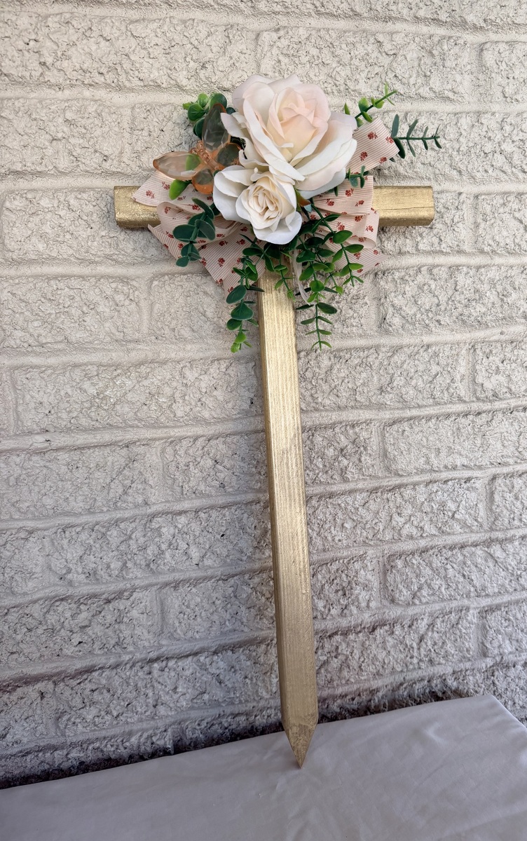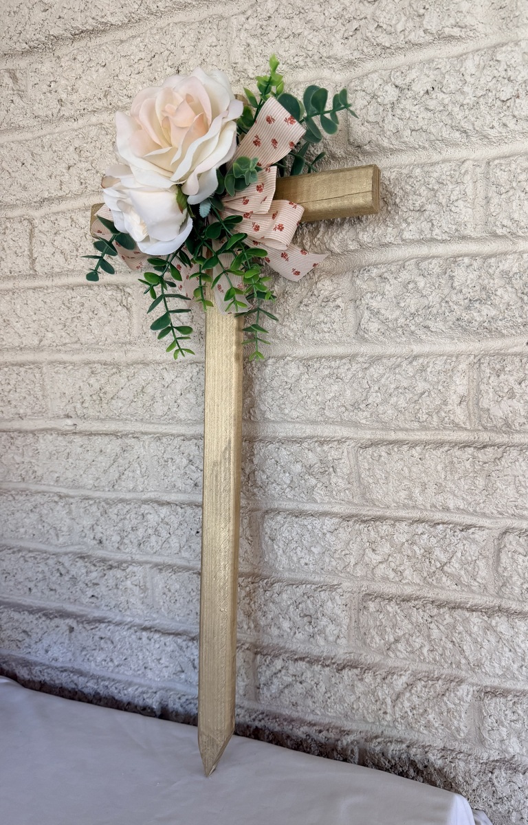 This NEW 24” pine cemetery cross has been painted gold with two pale peach-pink roses. vine greenery, an acrylic peach butterfly, and matching floral ribbon. The cross has a pointed end for easy ground insertion. Every cross is sprayed with a coat of clear polyurethane to protect the ribbon and silk flowers from outdoor elements.
