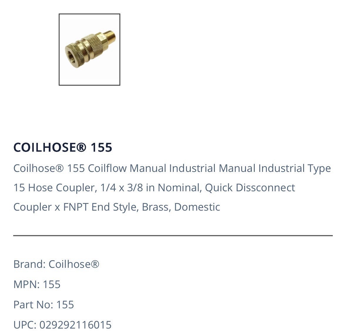 5-COILHOSE Industrial Type-15 1/4” Body Pneumatic Quick Coupler X 3/8” Male NPT