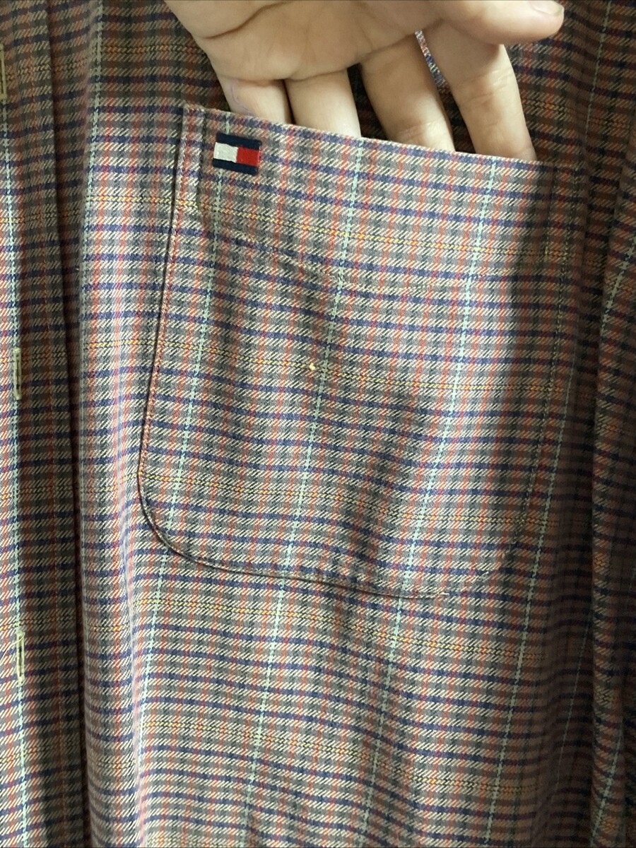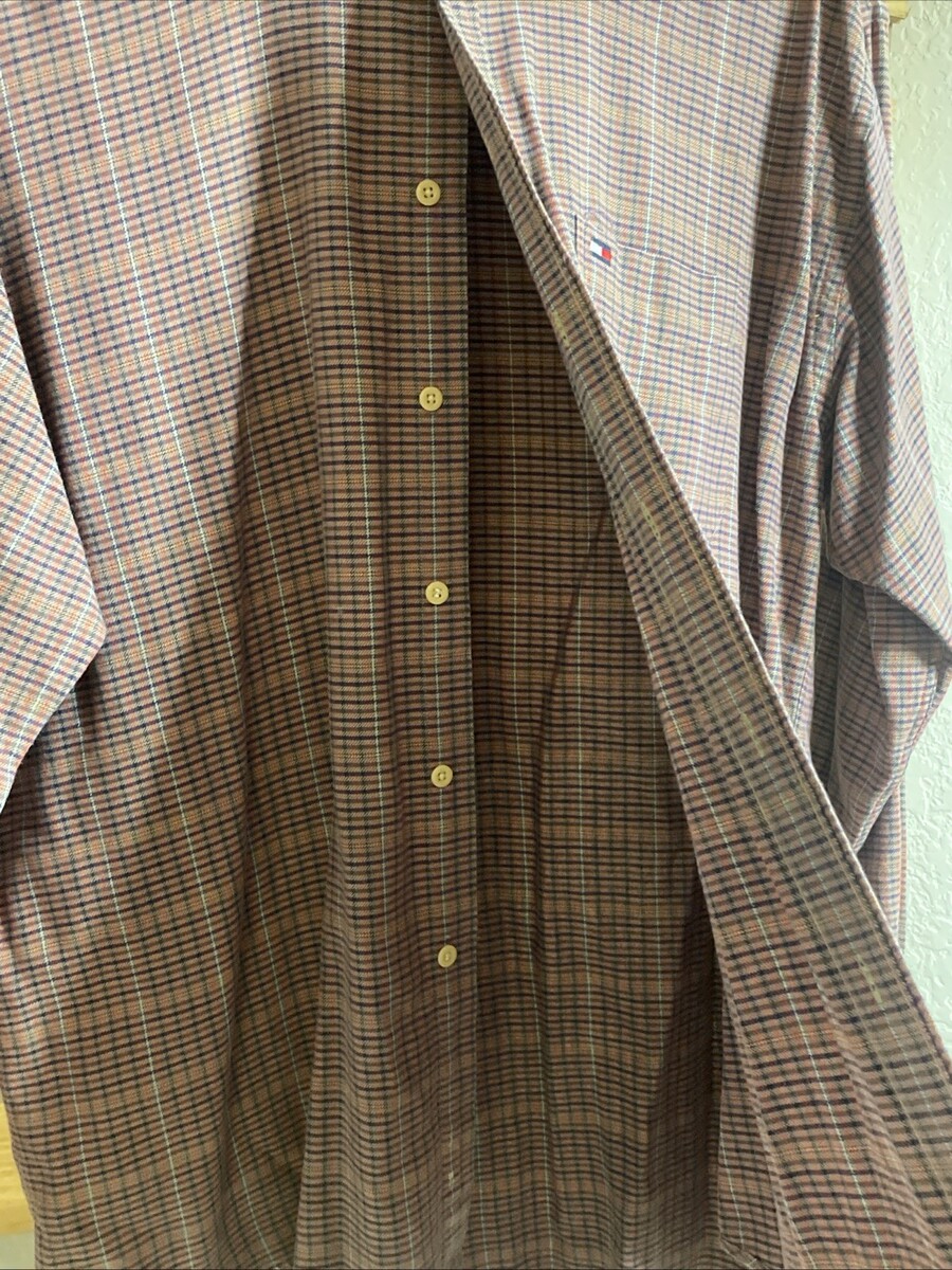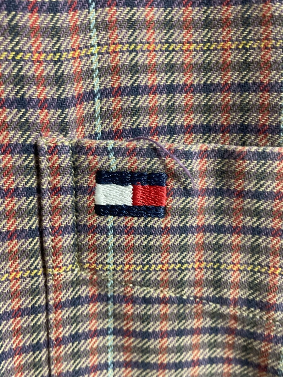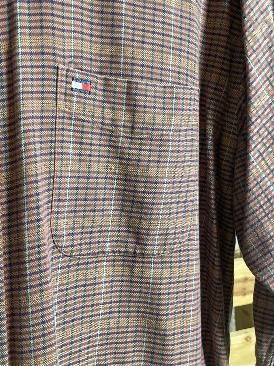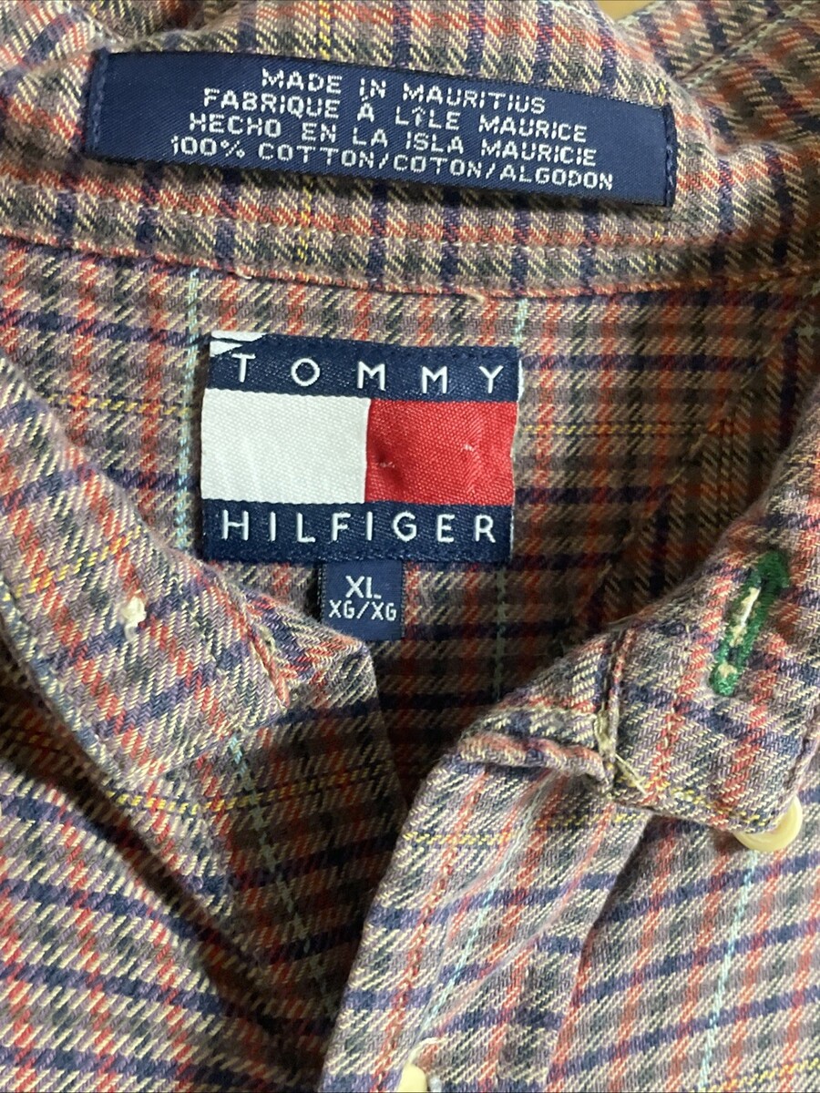 This vintage Tommy Hilfiger long sleeve button down shirt in size XL features a classic plaid pattern in multicolor, made from cotton knit fabric. It has a collared neckline with a button-down style, perfect for casual occasions. The shirt also includes accents such as button details, embroidered logo, and pockets, reflecting a vintage style from the Tommy Hilfiger Tommy Jeans product line. Designed for all seasons, this button-up shirt embodies a timeless classic theme, ideal for men who appreciate quality and style in their wardrobe.