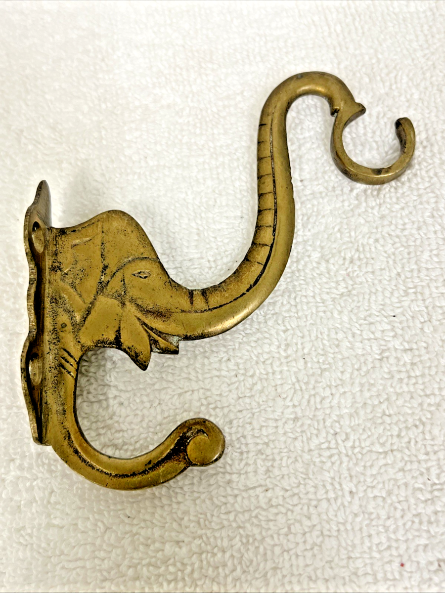 Vintage Brass Figural Elephant Head Coat Hook Hanger Stamped India 4" x 4 1/4". Nicely done figural elephant head using trunk with hook end as hanger portion, measures approx. 4" from back bracket to hook end and 4 1/4" long from trunk to bottom of bracket, no damage, nice condition. See pictures.