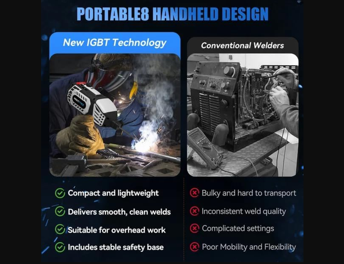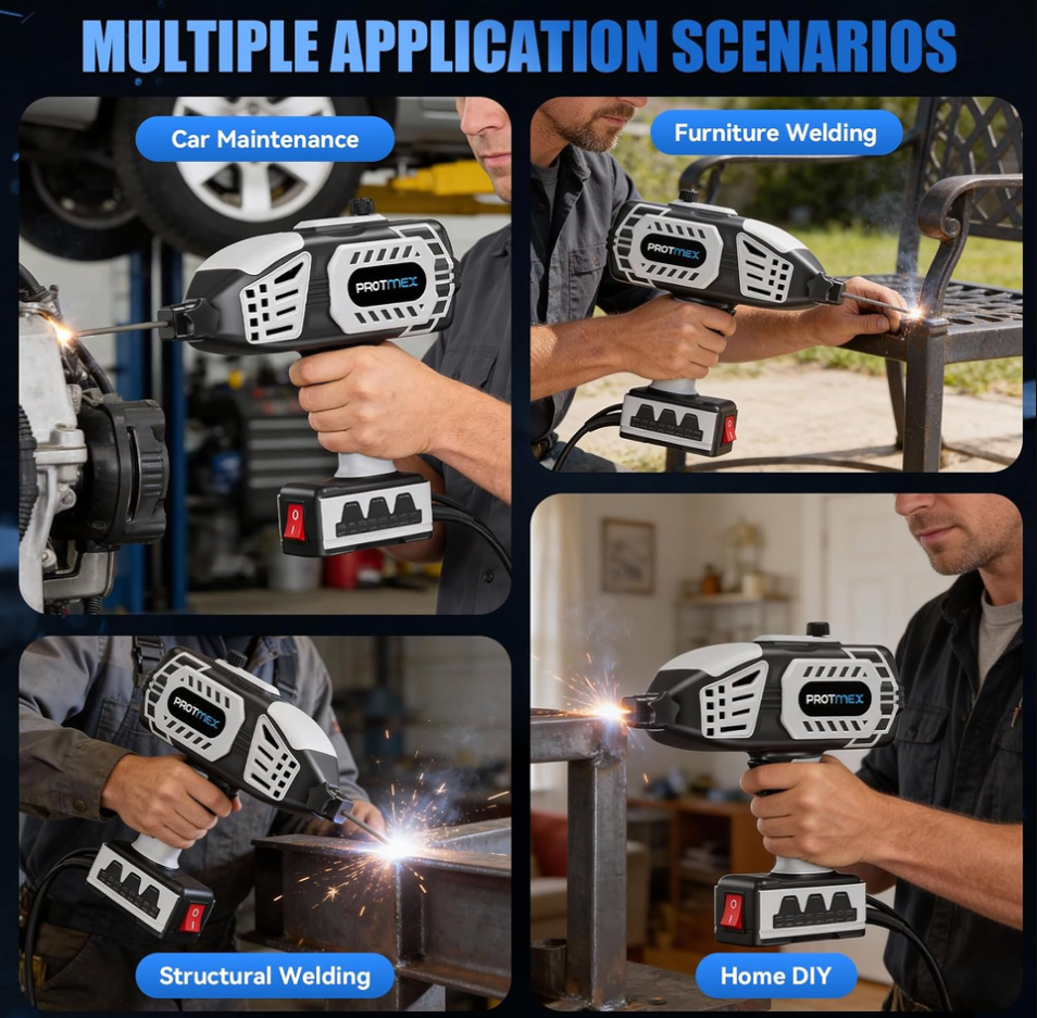 ?Intelligent IGBT Inverter Technology? PROTMEX portable welder machine utilizes an advanced IGBT inverter core, which achieves instantaneous, smooth arc ignition and extremely stable output current. Combined with automatic current compensation, the handheld welder adapts in real-time to different welding environments, effectively preventing electrode sticking and arc interruption, ensuring clean and strong welds