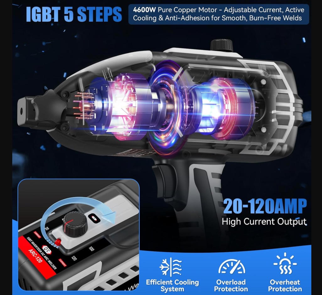 ?20-120A Adjustable Current Output?This handheld welder provides adjustable current from 20 to 120 amps, and a 5-position knob for precise adjustment to electrode size and metal thickness, ensuring a stable arc and smooth weld. Compact and powerful, this precise control effectively guarantees arc stability during the welding process, which is fundamental to achieving smooth and strong welds
