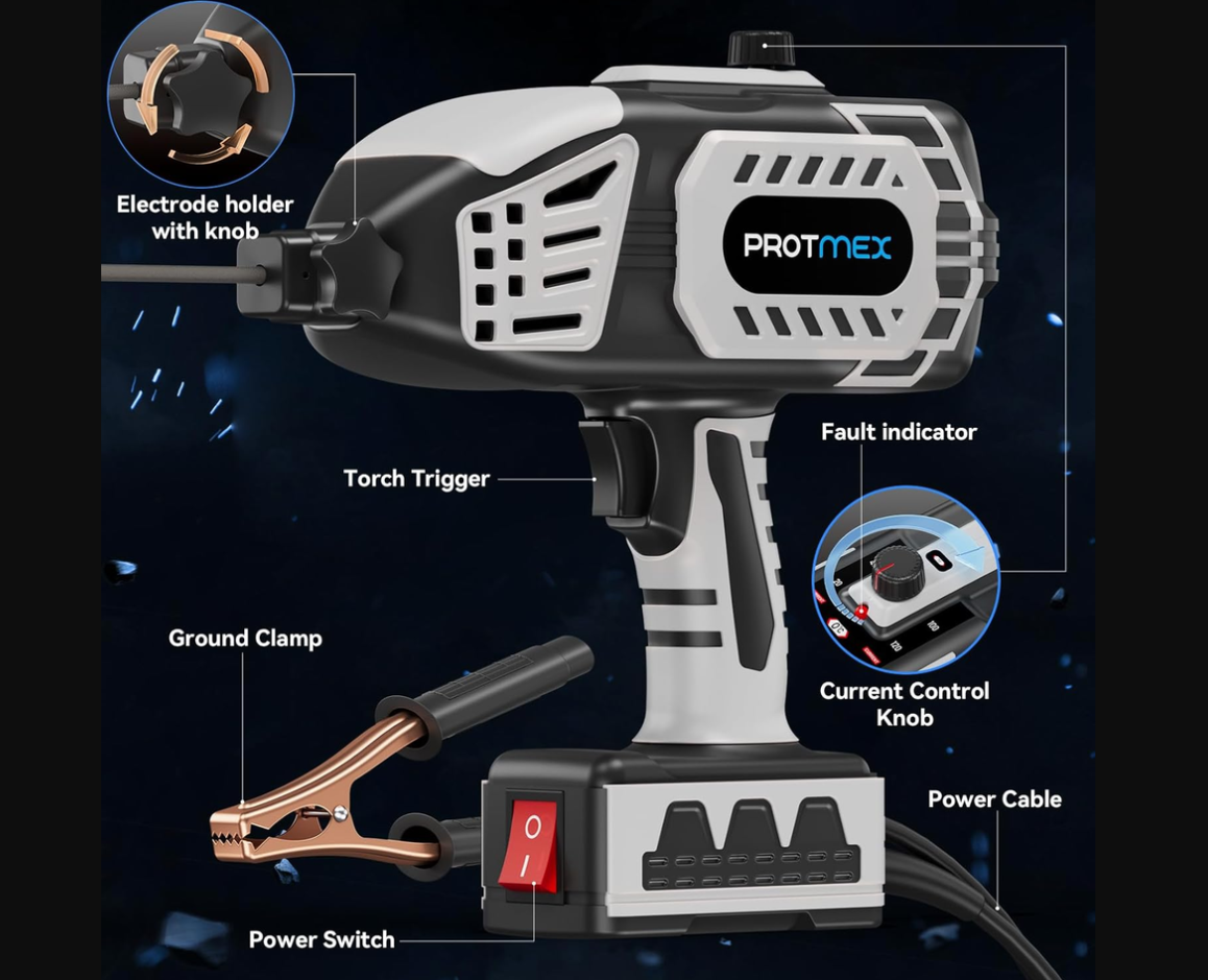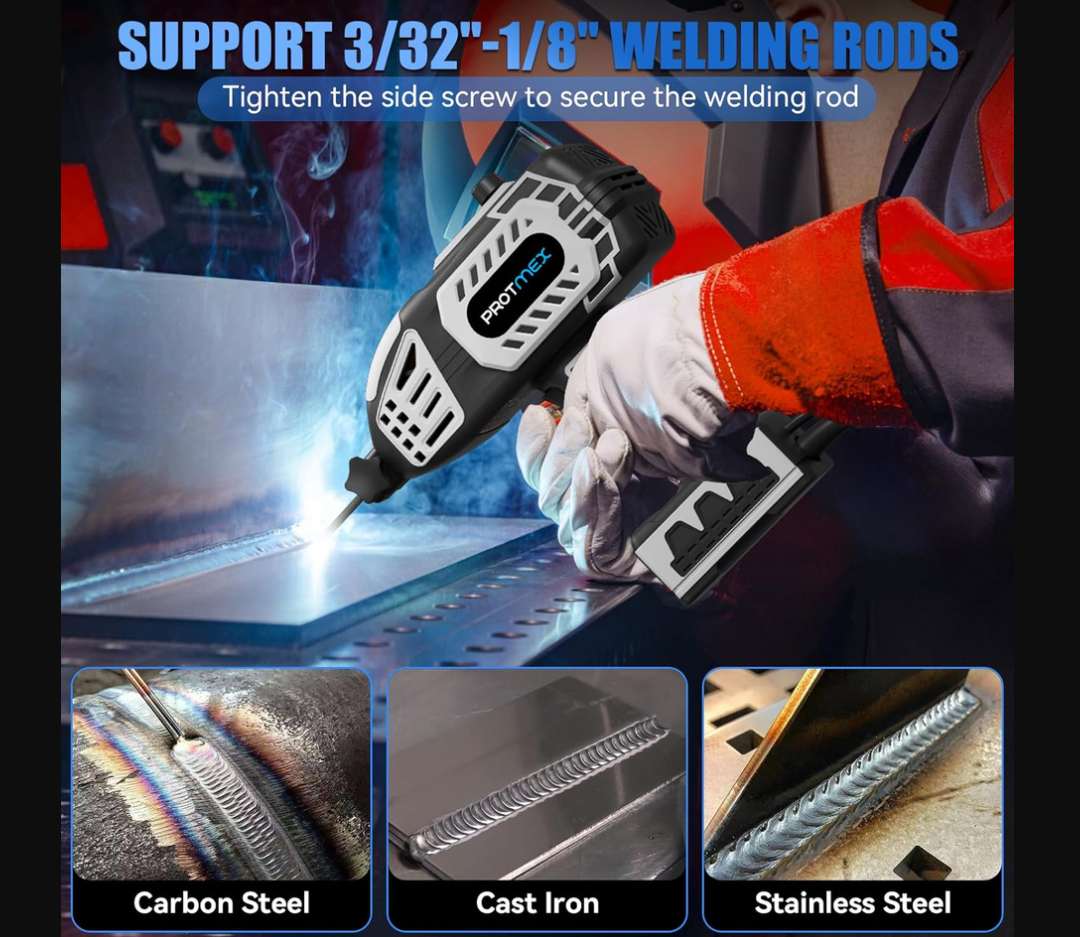?Compatible Multiple Rod Sizes Metal Types?This electric welder supports 3/32 to 1/8 inch (2.5โ3.2 mm) electrodes and includes 20 welder rods. Handheld laser welder stainless steel, carbon steel, iron, and other common metals with ease, making it a good helper for automotive, machining, fencing, and hardware projects. The hot arc start ensures smooth ignition and cleaner welds, while the easy-change knob saves time and boosts efficiency