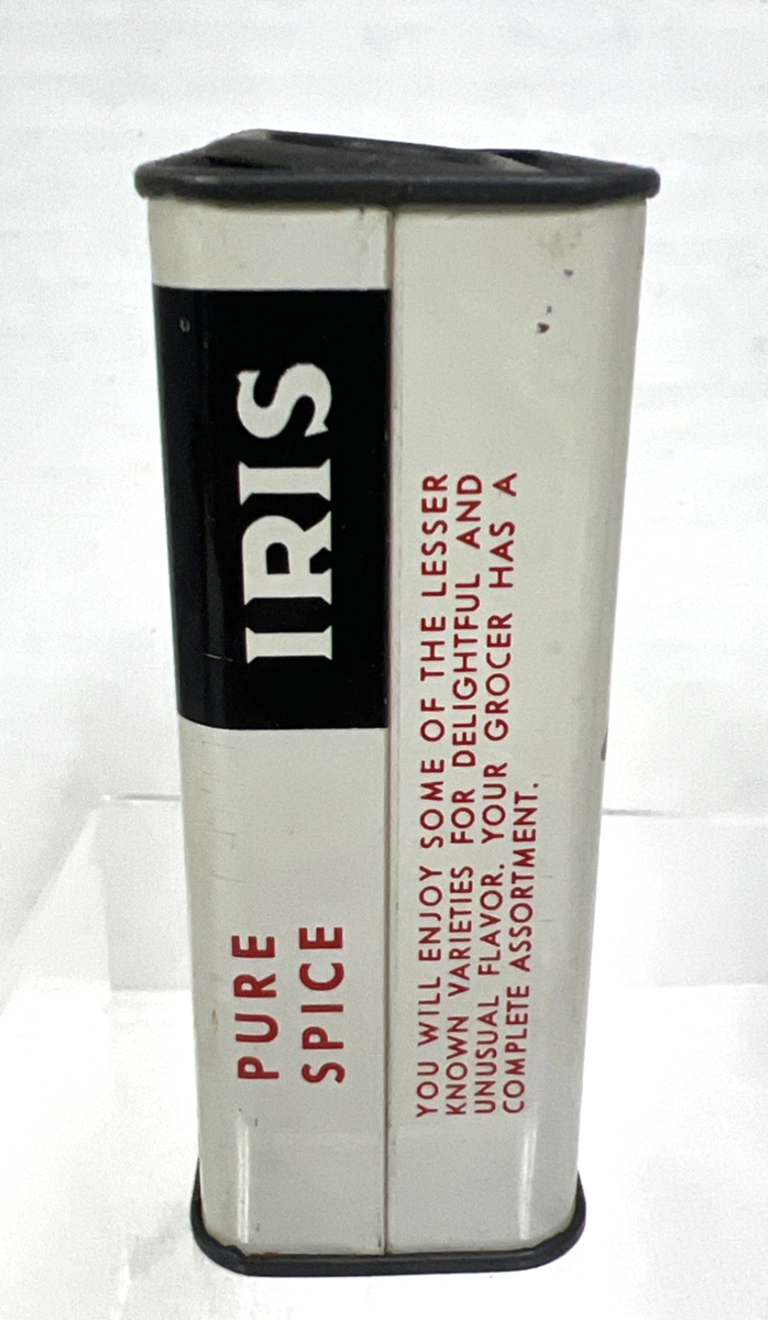 Vintage White Purple Flower Iris Poppy Seed Spice Tin Smart Final Los Angeles California. Cute Iris spice tin with a purple iris flower measures approx. 3 3/8" tall, Iris litho tin has a Poppy Seed sticker, overall very nice condition, top lid area has some darkening, inside clean, no dents. See pictures.