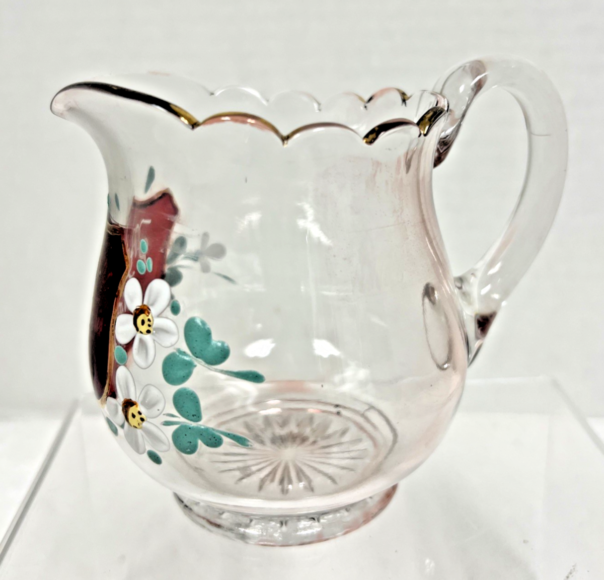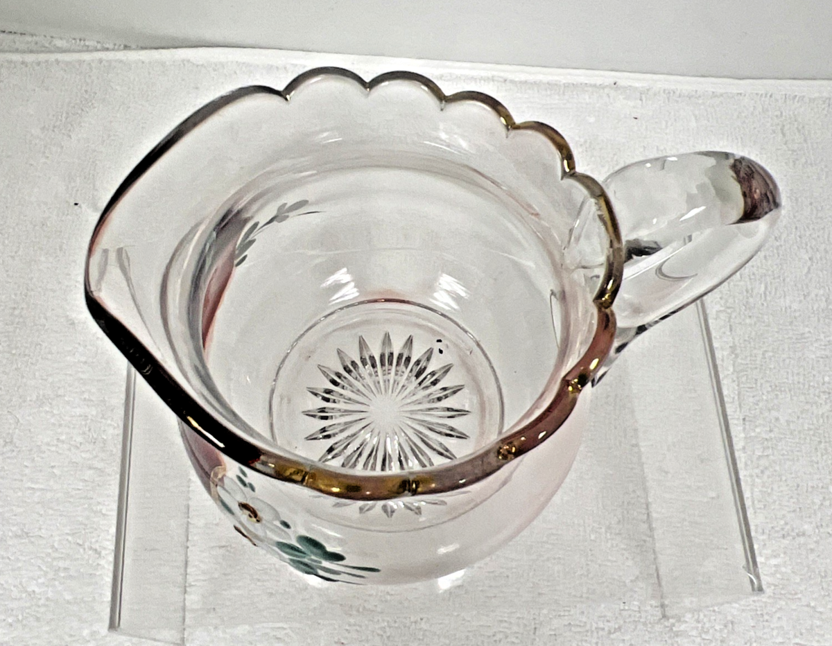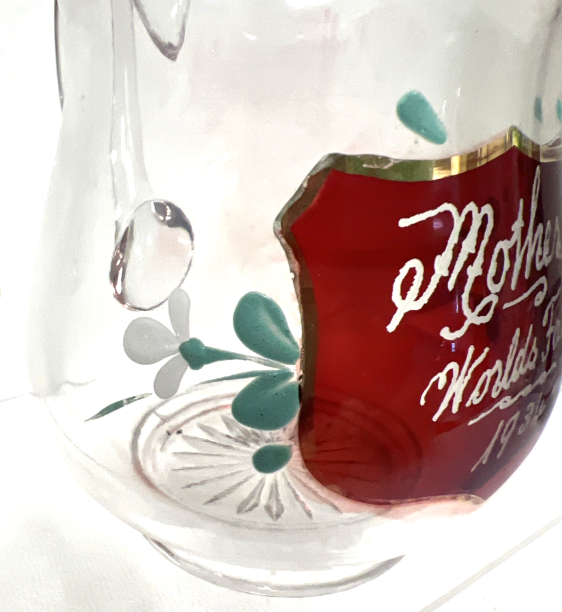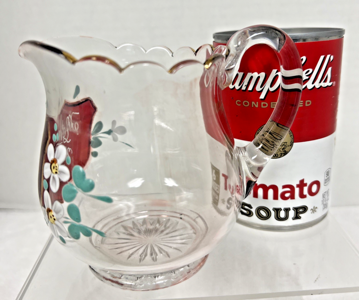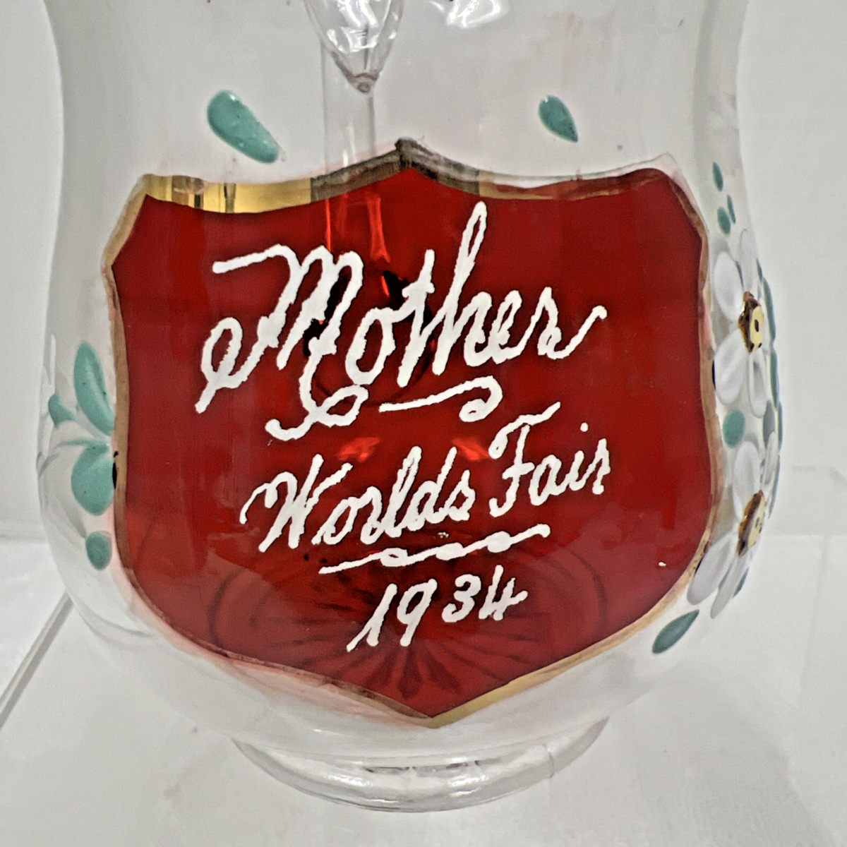 Vintage 1934 Mother Worlds Fair Ruby Painted Flowers Scalloped Edge Pitcher. Scalloped gold gilt accent rim edge pitcher center front design ruby flashed shield Mother World's Fair 1934 then painted white daisy like flowers, measures approx. 4 3/8" tallest point and 4 3/4" wide spout to handle end, no chips cracks, some wear to gold rim accent, floral enamel painted flowers great condition. See pictures.