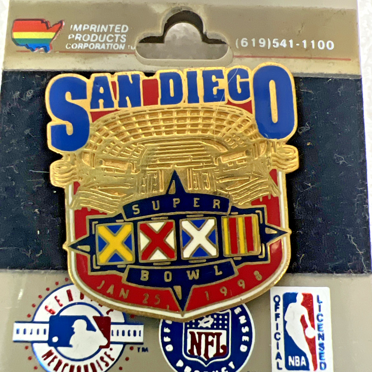 Vintage 1998 Super Bowl XXXII San Diego Football Champions Souvenir Jacket Pin. Super Bowl XXXII pin from 1998 San Diego champions, measures approx. 1 1/4" x 1 1/8", could be coat jacket hat pin button, on original plastic display, very good condition. See pictures.