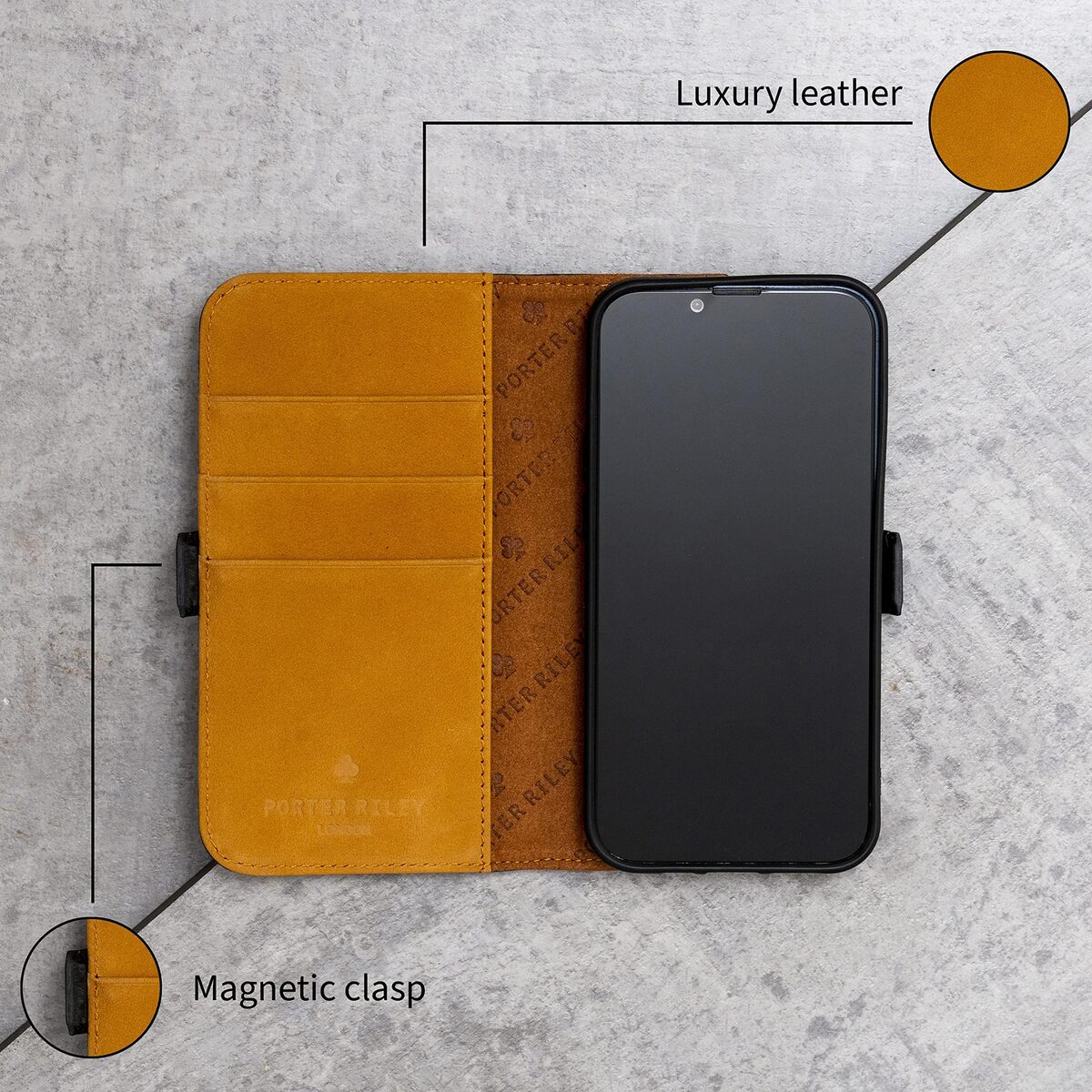 GENUINE PREMIUM NUBUCK LEATHER. Our finest quality nubuck leather offers a sleek finish for your iPhone 16 Pro Max whilst being sumptuously soft to the touch. This natural suede-like grain is finished in a gorgeous coloured hue with hand stitched edges, a contrasting interior colour and our signature club logo.,MAGNETIC CLASP. A discreet magnetic clasp closure keeps your iPhone 16 Pro Max case looking streamline whilst also ensuring your case remains secure. The Porter Riley iPhone 16 Pro Max Wallet case also features 3 card slots.,TWO-TONE DESIGN. Whether you wish to standout ? or you?re just indecisive ? our two-toned nubuck case is a smart way to show off your style, at work and play.,SOFT SILICONE SHELL. Your iPhone 16 Pro Max cover features an inbuilt silicone shell securely holds your handset in place, protecting both front and back from scratches, scuffs and scrapes, and absorbing any impacts.,PORTER RILEY: A GENUINELY BRITISH BRAND. Since 2012, Porter Riley has been designing premium leather phone cases in the UK. Created by two London based designers, the club logo on every case represents our dedication to quality and craftsmanship.