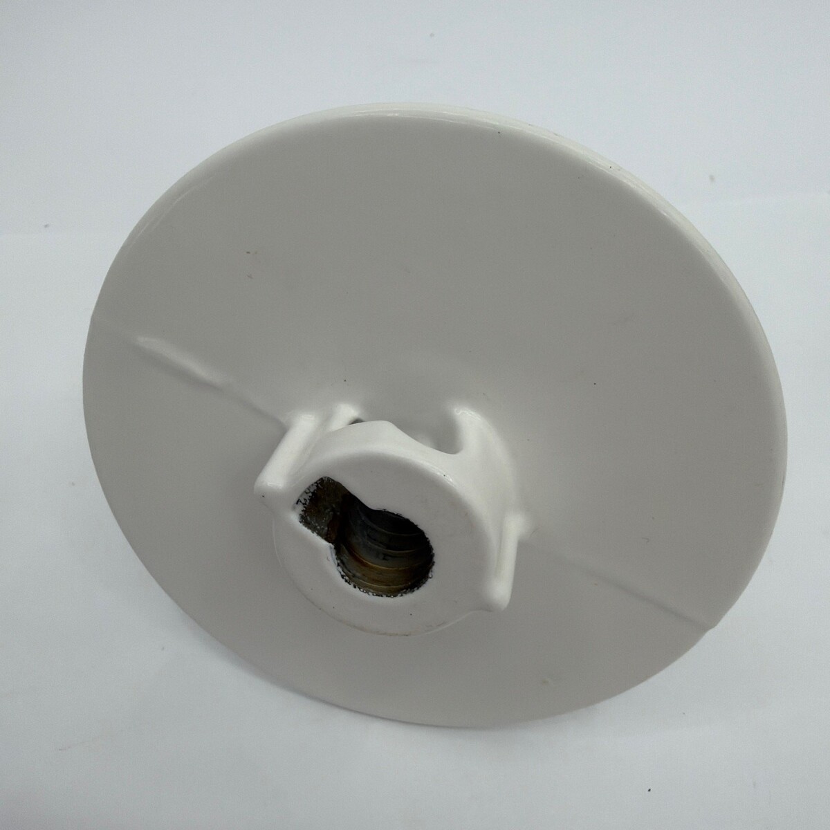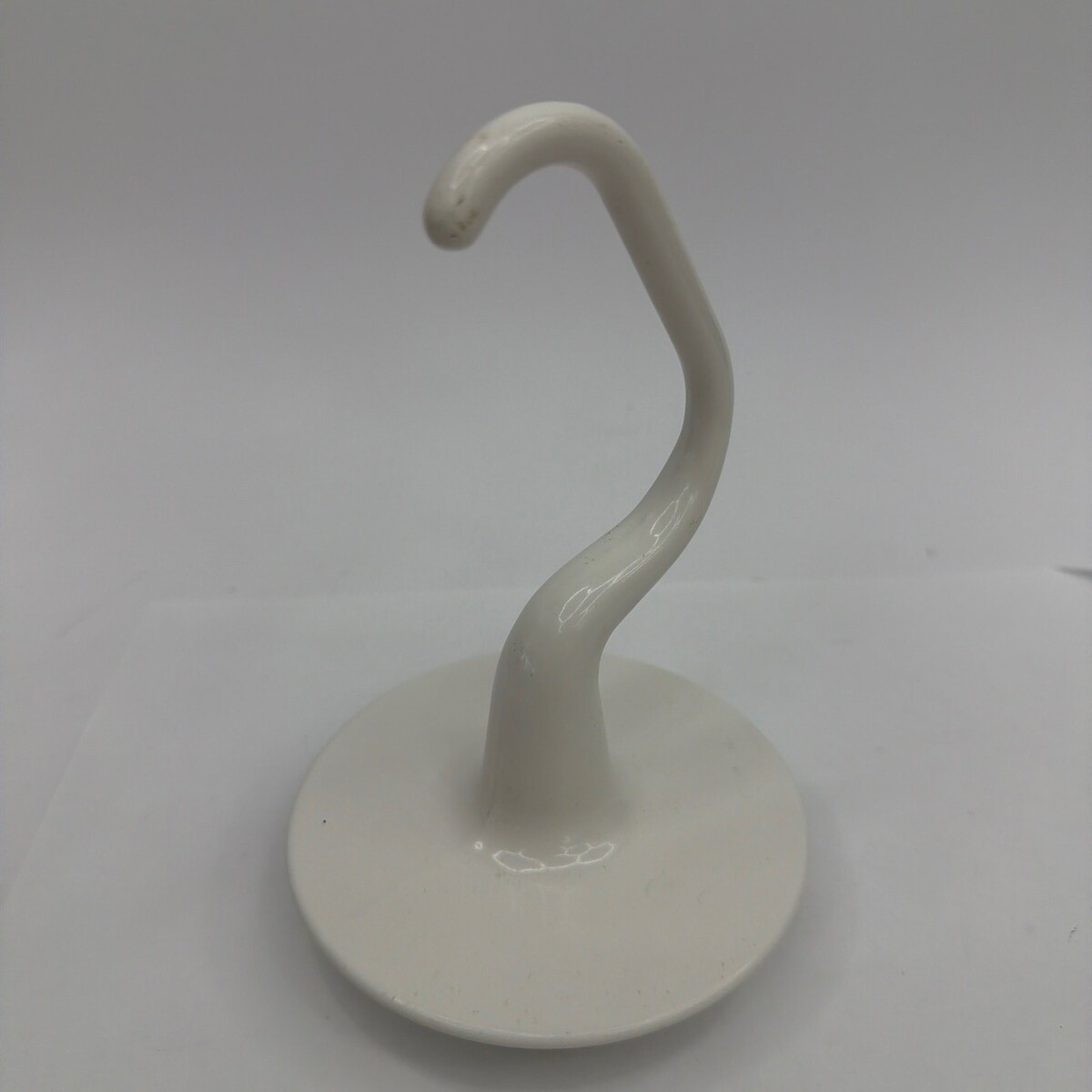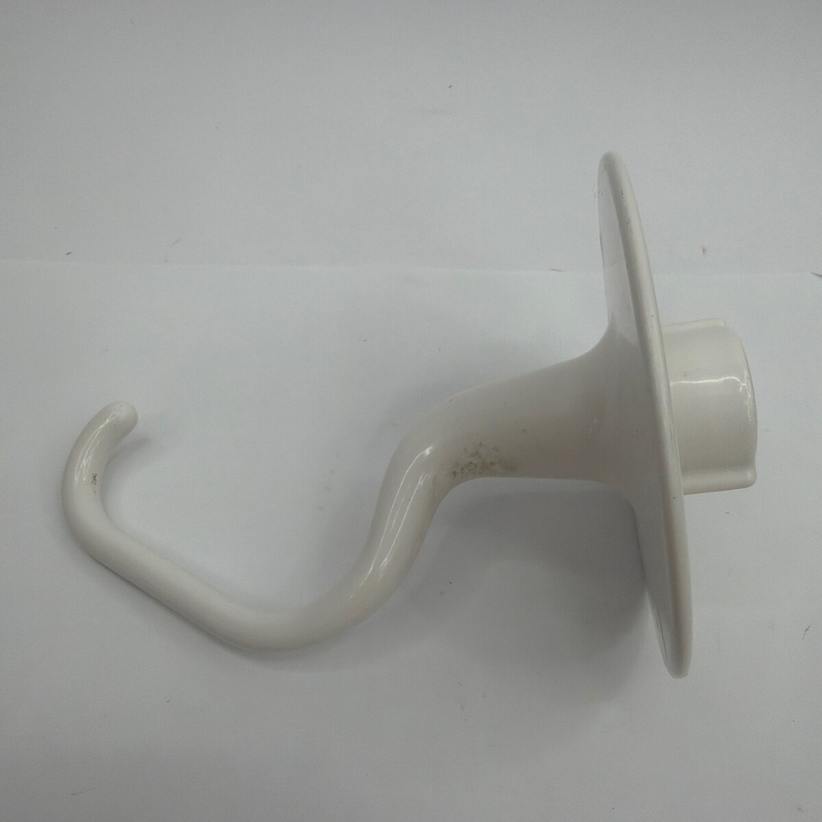 KitchenAid hook-style attachment in white coated metal. Shows light to moderate cosmetic wear with scuffs and some discoloration. Threaded mounting insert is present; compatibility depends on your specific KitchenAid model?please compare to your existing part. Includes only the attachment shown.