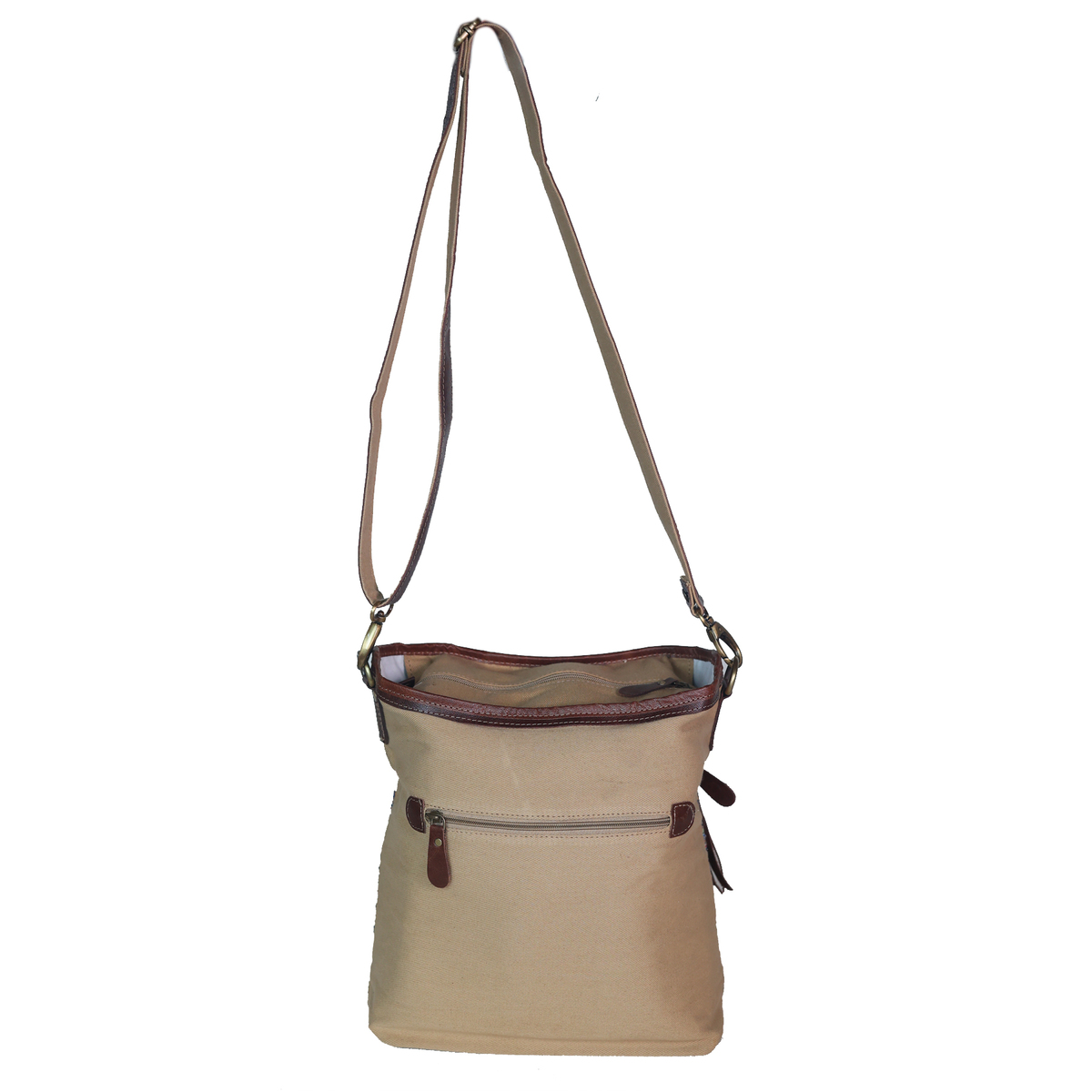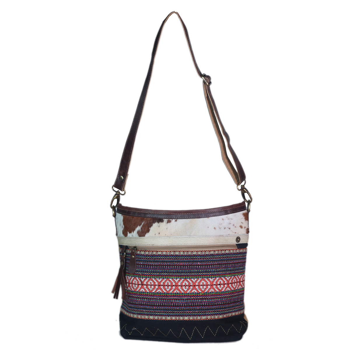 Challenger women's handbag made from upcycled canvas and full-grain leather accents. Shoulder bag features a multicolor design, with cowhide accents. This practical, lightweight, and conveniently sized roomy bag is made sturdy to endure everyday use. Includes a removable shoulder strap. Perfect choice for school, work, or travel. Main compartment has a full zipper closure with a wide opening to easily access your belongings. The fully lined interior also features a side zippered pocket, and two open pockets for additional storage. There are also zippered pocket at the front, and back of bag to store easily reachable items. The antique finish brass hardware beautifully ties the bag together. Bag measures 13.5" L x 12.5" H providing plenty of room for all of your everyday essentials.