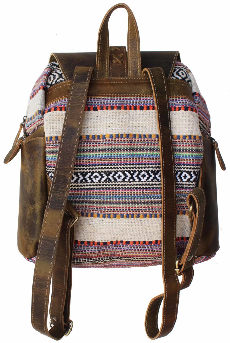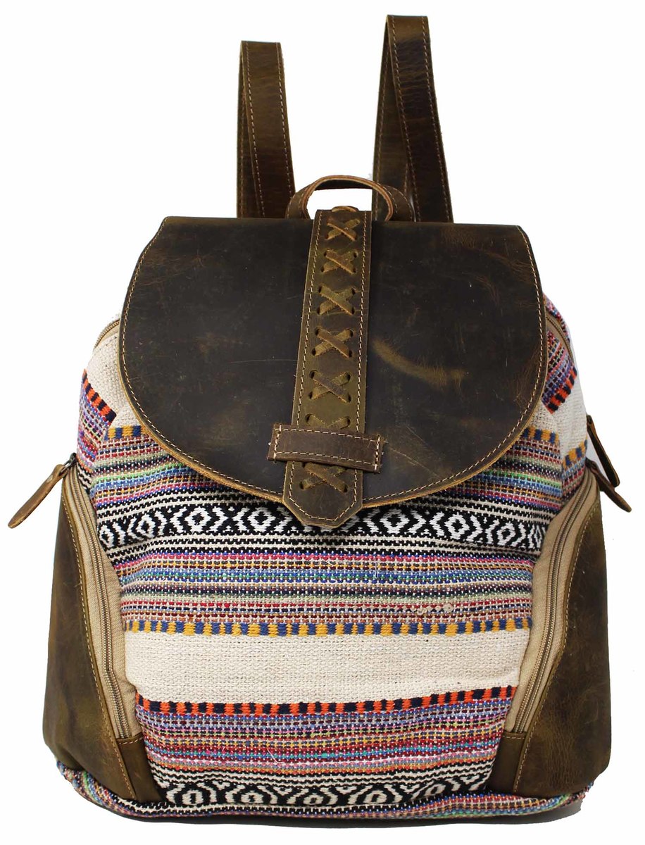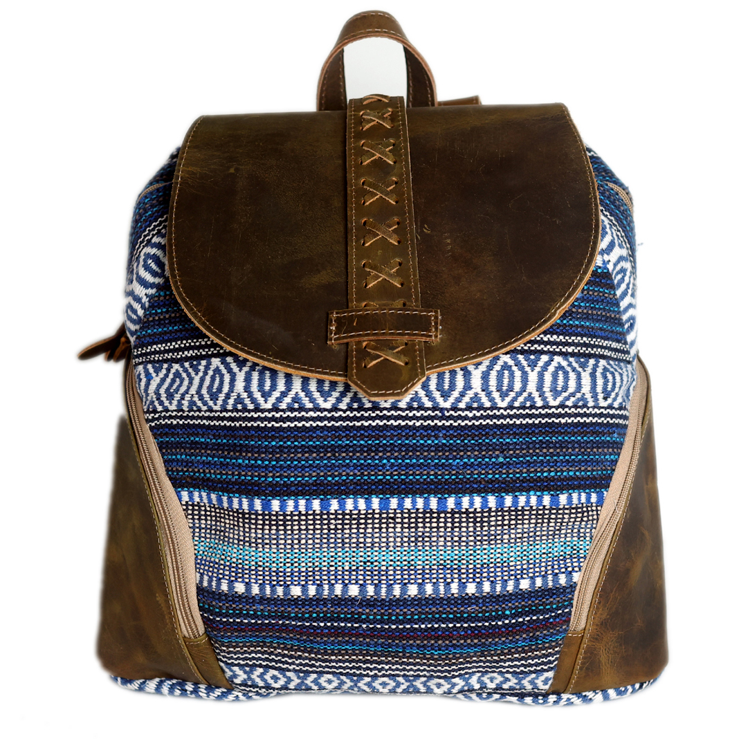 Challenger backpack made from upcycled canvas and full-grain distressed leather accents. Beautifully accented with a navy patterned design. This practical, lightweight, and conveniently sized backpack is made sturdy to endure everyday use. Perfect choice for school, work, or travel. Main compartment has a button and full zipper closure. The fully lined interior also features a large open pocket for additional storage. There's also two smaller zippered side pockets for storing easily reachable items. The antique finish brass hardware beautifully ties the bag together. Bag measures 13" L x 12" H providing plenty of room for all of your everyday essentials.