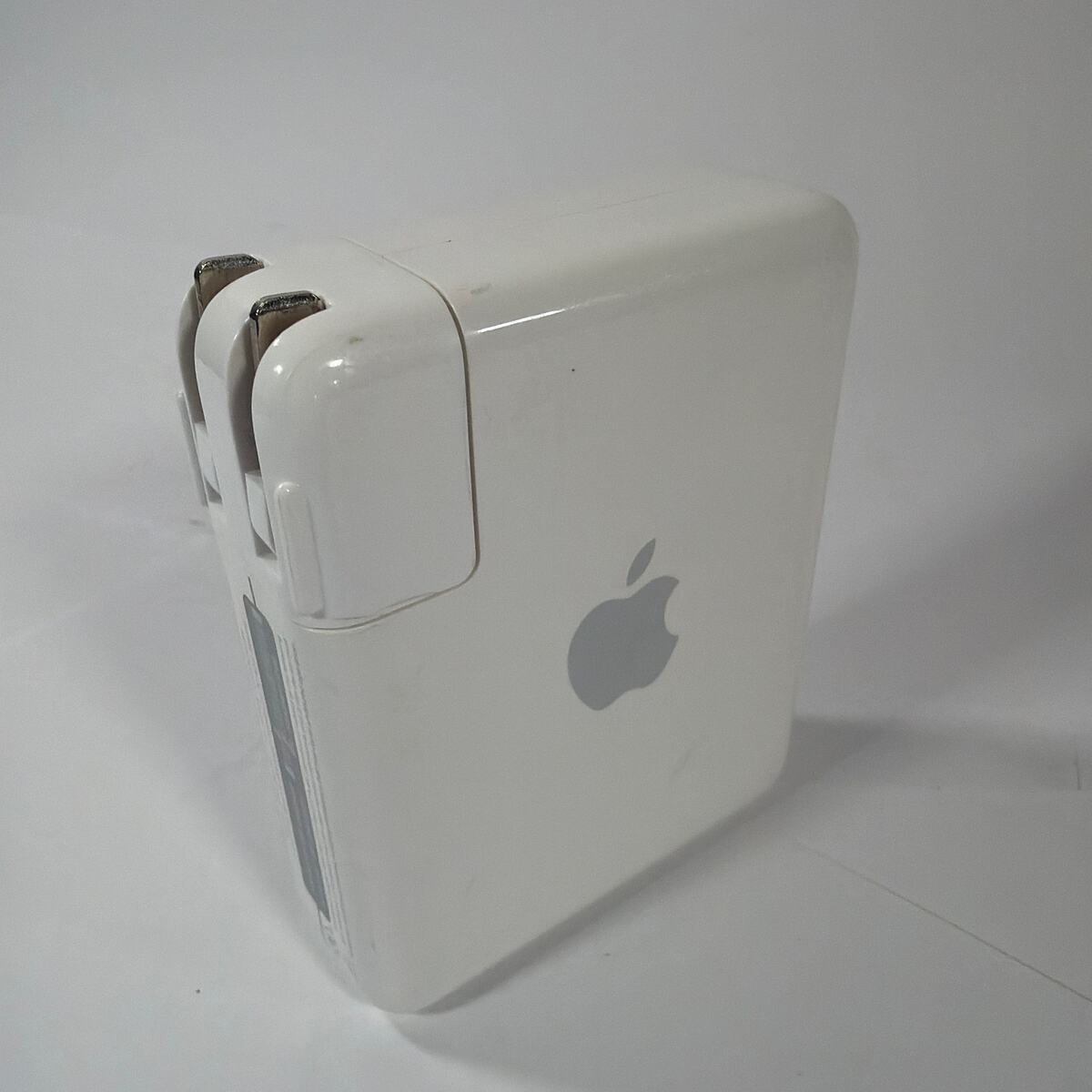 Apple AirPort Express base station/router, model A1084 (M9470LL/A), in white. Device was powered on and has been reset. Cosmetic wear is present (scuffs/marks and minor discoloration may be visible). Only the unit is included; no box, manuals, or other accessories are shown. This older model may require legacy AirPort Utility software to configure.