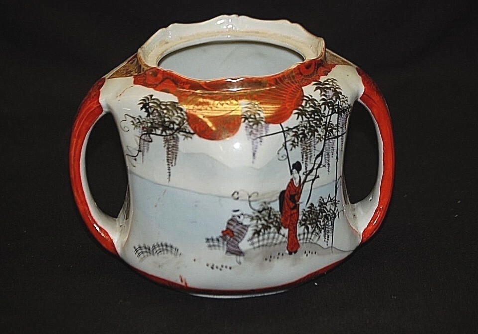 Old Vintage Asian Orange & Gold Two Handled Jar or Planter w Geisha Women Japan