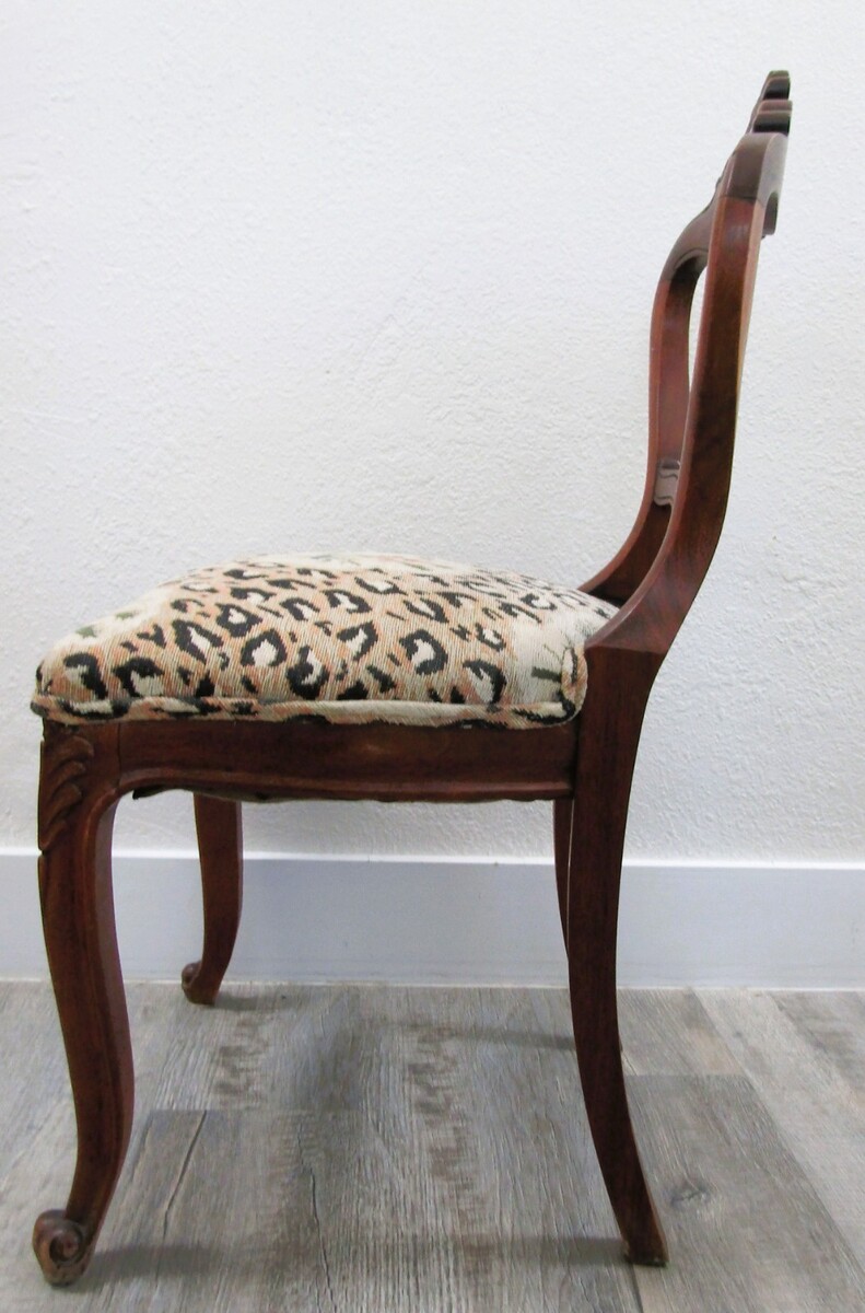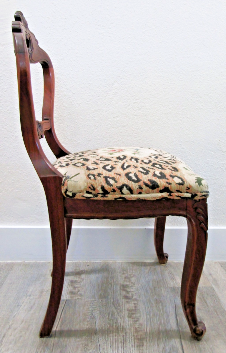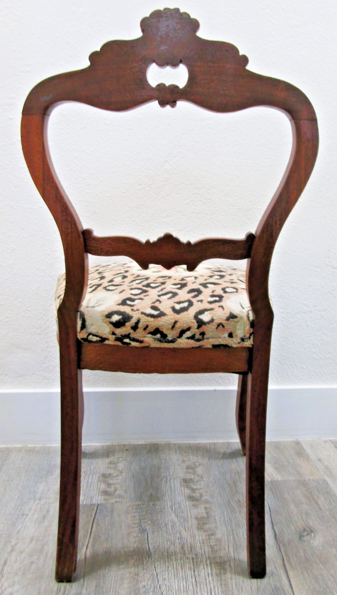 Antique Victorian Carved Walnut Balloon Back Occasional Side Chair with Rose Cheetah Patterned Upholstery