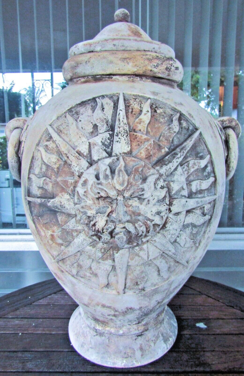 Large Outdoor Pottery Lidded Urn with Sun Motif and Faux Handles 26" Tall