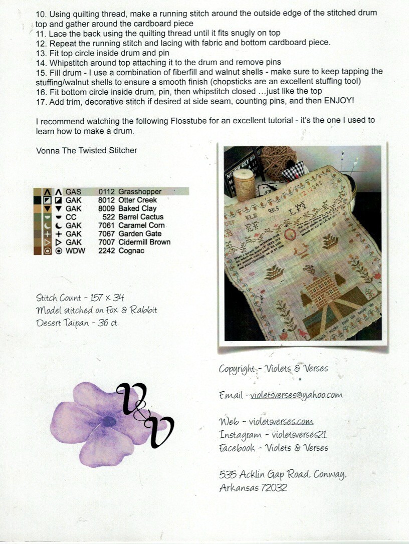 Violets & Verses Cross Sttich Chart Elizabeth's Drum Pincushion