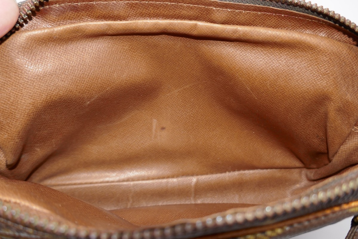 The Louis Vuitton Vintage Monogram Canvas Pochette Marly Bandouliere Crossbody Bag is a small rectangular crossbody bag made with coated canvas and leather in a brown exterior color. This designer bag measures approx. 8.5" wide and 5" tall with some wear inside and to the leather as well as the zipper. This is an early 80's bag which did not include date codes. The bag has a vintage charm and is a timeless piece from the Louis Vuitton Marly product line, perfect for casual occasions. Made in France, this stylish bag exudes luxury and sophistication for the fashion-forward woman.