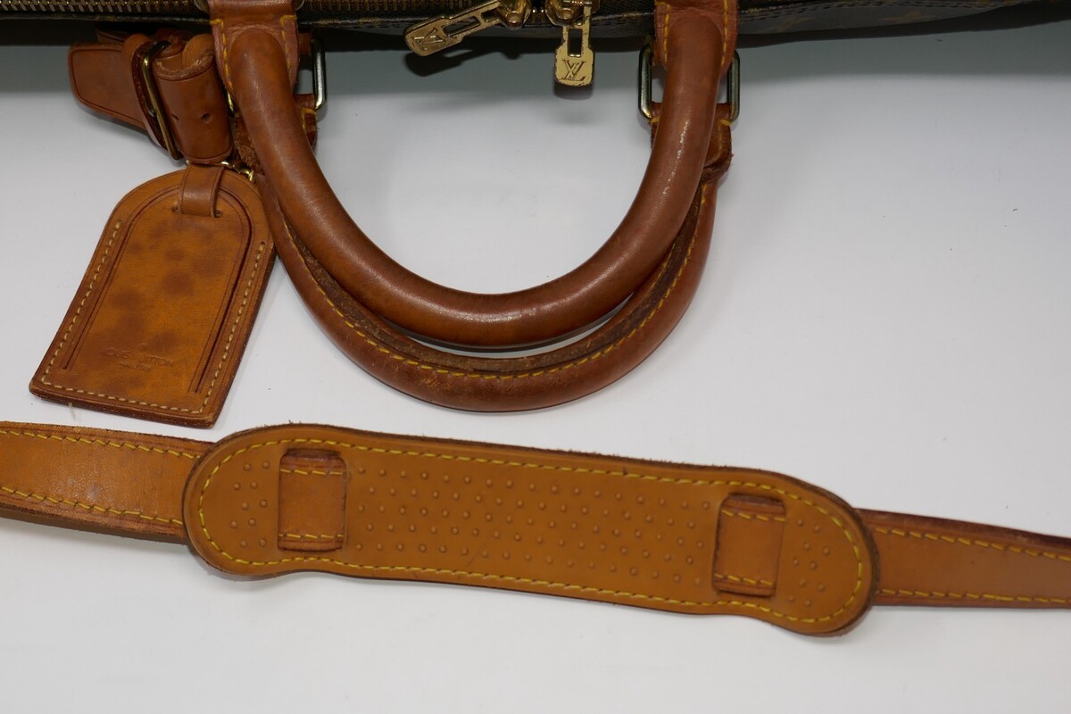The Louis Vuitton Vintage Monogram Canvas Keepall 55 Bandouliere Malletier Duffle is a luxurious and stylish bag designed for travel and everyday use. This measures approx. 22" wide, 12" tall and 9.5" deep with some discoloring, stains and pen marks inside. The outside has some wear and stains to the natural cowhide leather vachetta and some scuff marks with one being deep. Made from durable classic brown and tan Louis Vuitton Monogram coated canvas, this extra-large rectangular bag features a zip closure, double brown leather handles, and gold colored brass hardware accents. It comes with a luggage tag and detachable strap for easy customization and is perfect for the fashion-forward woman looking for a designer piece from the Louis Vuitton Keepall collection. Ideal for workwear, casual outings, or as a chic carry-on for travel, this duffle exudes sophistication and timeless elegance.