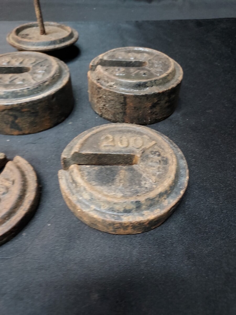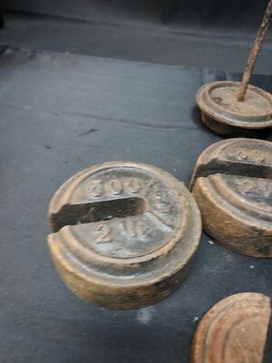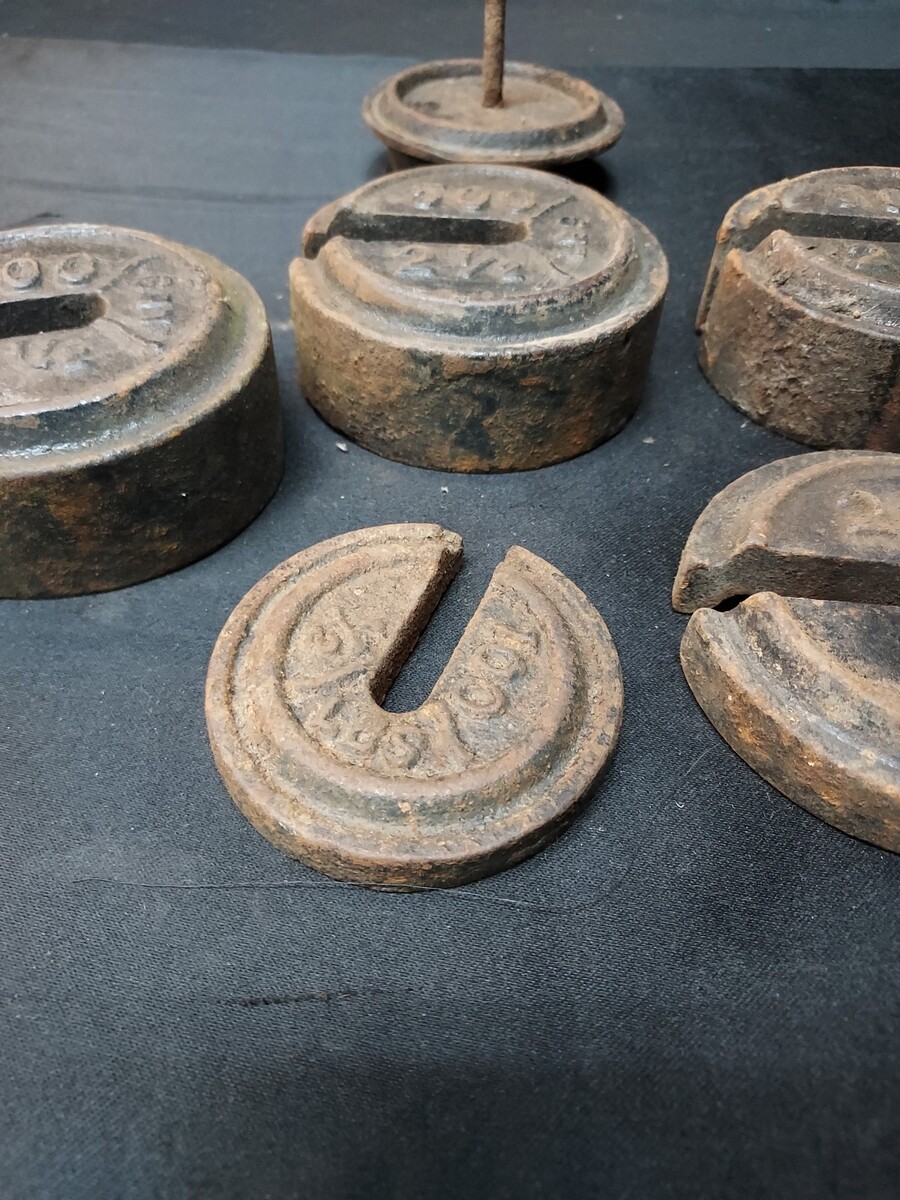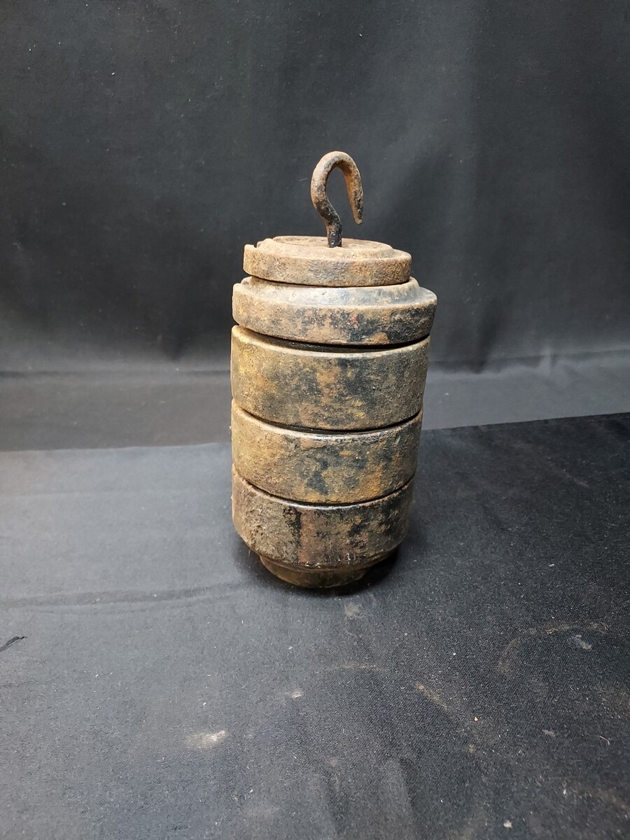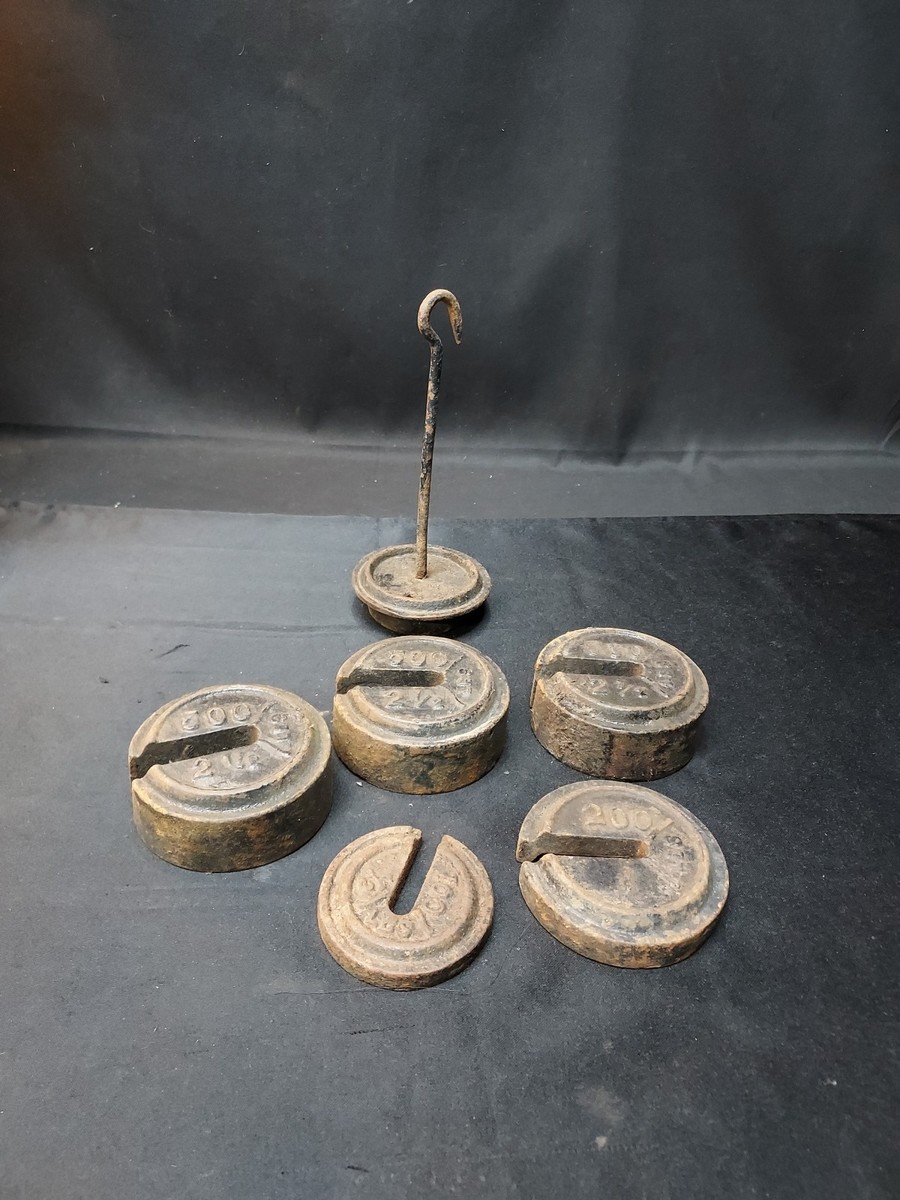 Lot of 4 Cast Iron Mercantile Platform Scale Round Slotted Weights & Hanger