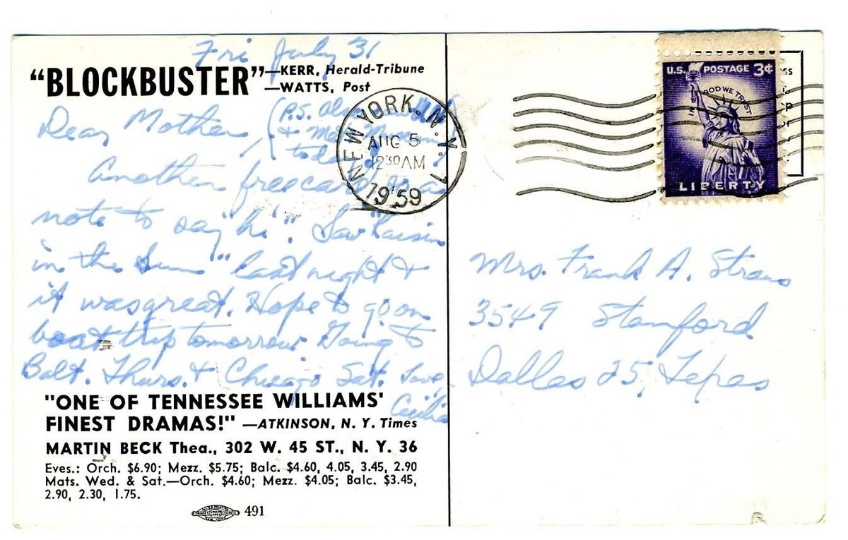 Mailed from New York City in 1959. A postcard used for advertising the Broadway Show SWEET BIRD OF YOUTH, starring Paul Newman and Geraldine Page,