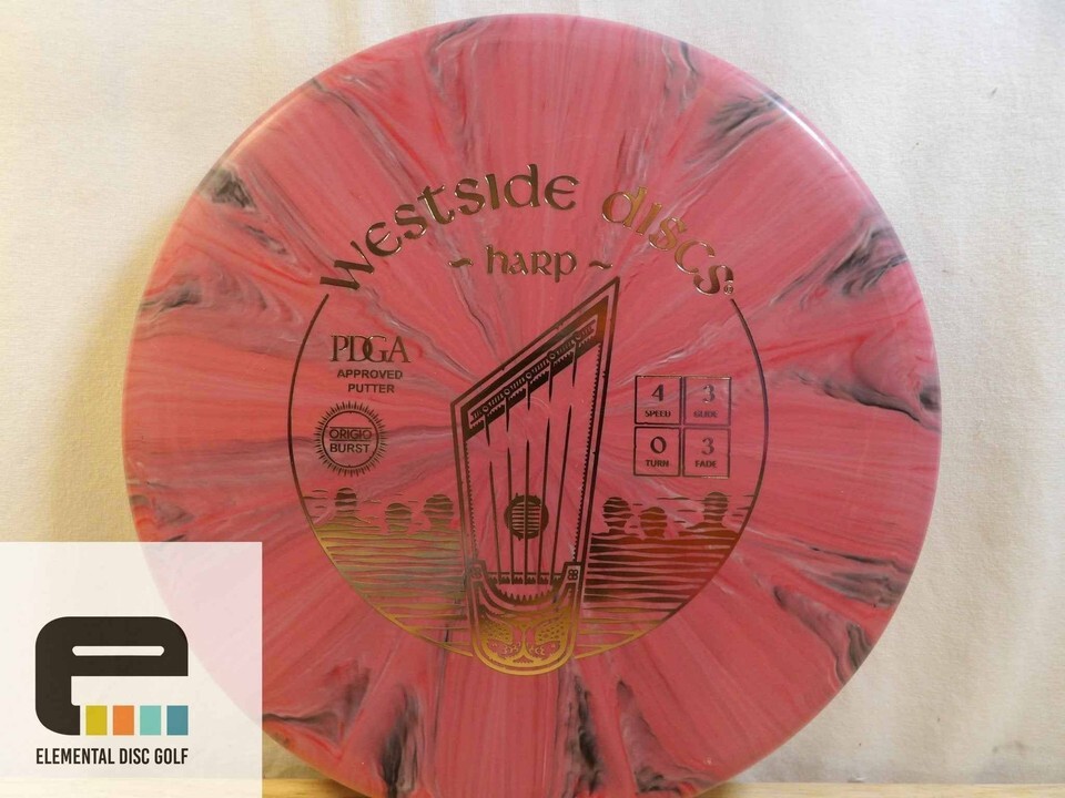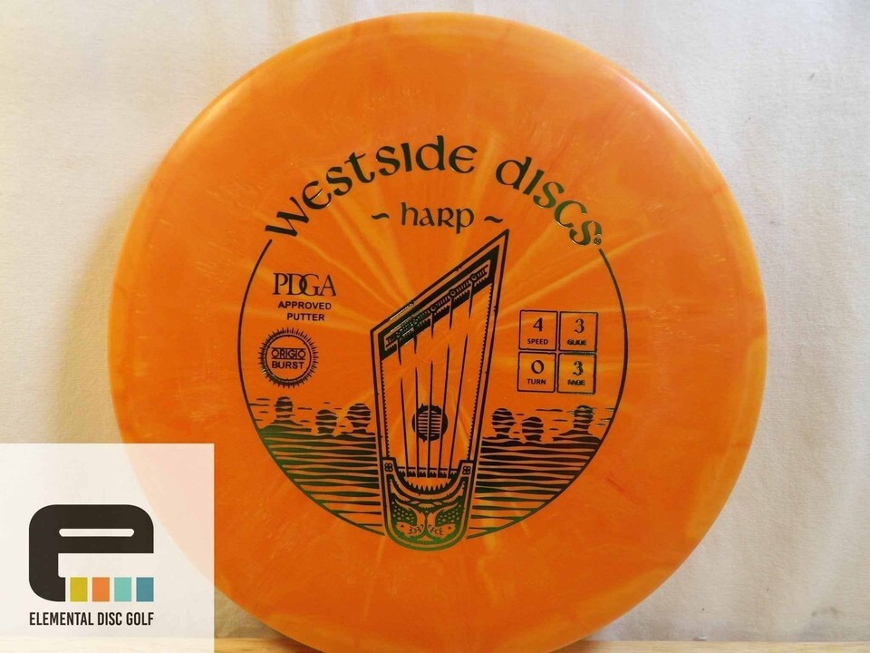Westside Discs Origio Burst Harp (4/3/0/3)The Westside Discs Origio Burst Harp (4/3/0/3) is our most reliable approach disc. Designed to withstand any type of condition. It will hold in the wind. For professional players, this could be their only approach disc they will need to carry as it can hold anyone's arm speed and still hyzer. For slower arm speeds, it will be your most overstable approach disc.Flight #'s: 4/3/0/3