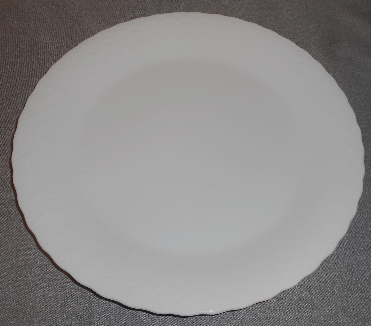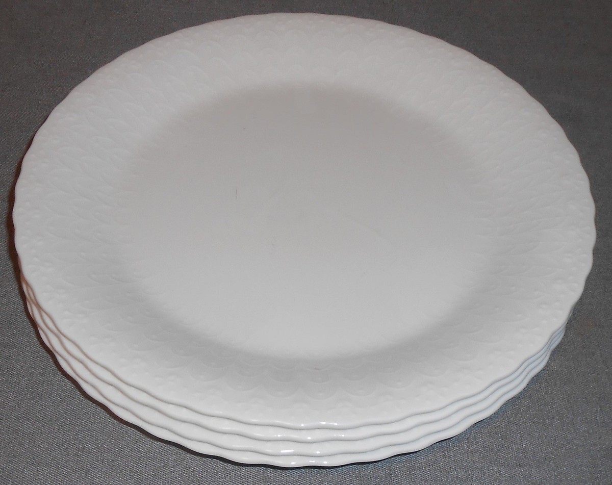 This is a very nice set of 4 Dinner plates measuring 10 5/8" in diameter made by Mikasa in the White Silk Pattern and Made in Indonesia. They are in good pre-owned condition with no chips or damage. Minimal utensil usage present.