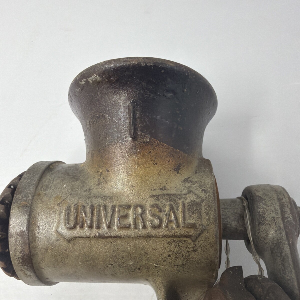 The Vintage Universal No. 1 Meat Grinder is a collectible small appliance made of durable cast iron, featuring a classic silver color and a matte finish. This manual meat grinder, manufactured in the United States during the 1950s, has a 1-cup capacity and comes with a handle for easy operation. The Universal brand ensures quality craftsmanship and reliability in grinding meat for your culinary needs.