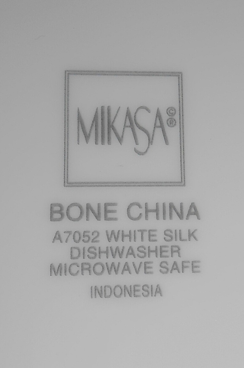 This is a very nice set of 4 Salad plates measuring 7 3/4" in diameter made by Mikasa in the White Silk Pattern, featuring an embossed flower-like rim. Made in Indonesia. They are in good pre-owned condition with no chips or damage. They look in excellent condition...as thou never used!