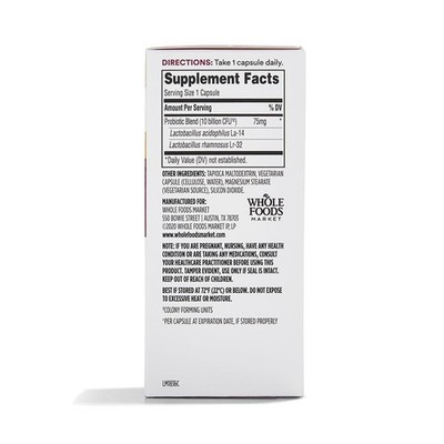 Expiration Date of 6/4/2027 ? Women's probiotic with 10 billion CFU ? 30 count bottle of vegetarian capsules ? Two clinically studied probiotic strains ? Supports digestive and vaginal health ? No refrigeration needed ? Created by Whole Foods Market ? Quality guaranteed potency ? Easy daily supplement