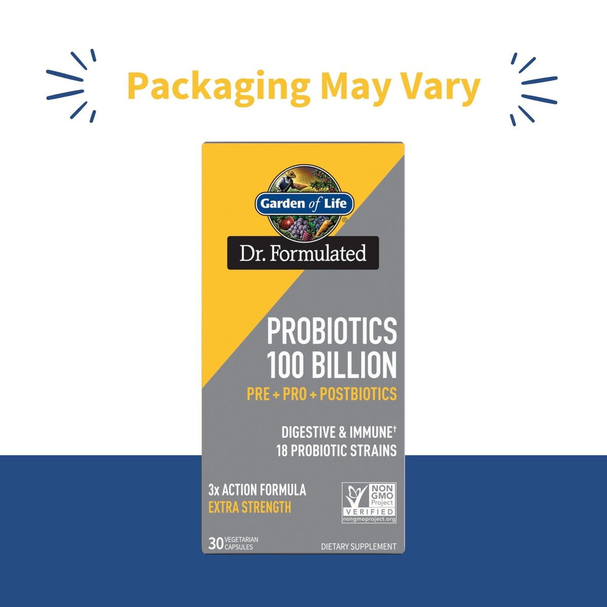 Expiration Date of 4/2026 ? TRIPLE ACTION FORMULA: One vegetarian capsule delivers a clinically proven probiotic supplement combining 100 Billion CFU probiotics, 65mg prebiotic blend, and postbiotics for digestive and immune support* ? PROBIOTIC INGREDIENTS: Garden of Life probiotic features 18 probiotic strains including clinically studied HN019 and LP-115, as well as organic potato, acacia fiber, and PreforPro prebiotics with upcycled postbiotics for women and men ? DIGESTIVE IMMUNE SUPPORT: This unique formula supports digestive balance, regularity, and immune system health with clinically studied probiotics and innovative prebiotics that promote beneficial bacteria growth* ? CLEAN CERTIFIED: Non-GMO Project Verified, NSF Certified Gluten-Free, shelf stable, and contains no unnecessary binders or fillers?pure probiotic support for optimal gut and immune health* ? EASY DAILY SUPPORT: Adults take one vegetarian capsule daily; this extra strength 100 Billion CFU probiotic supplement provides shelf stable convenience for consistent digestive and immune support*