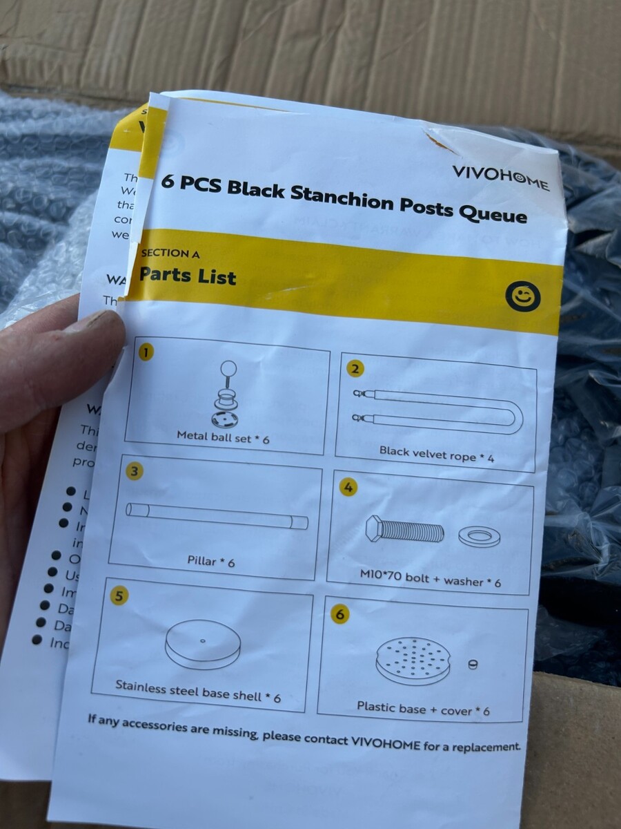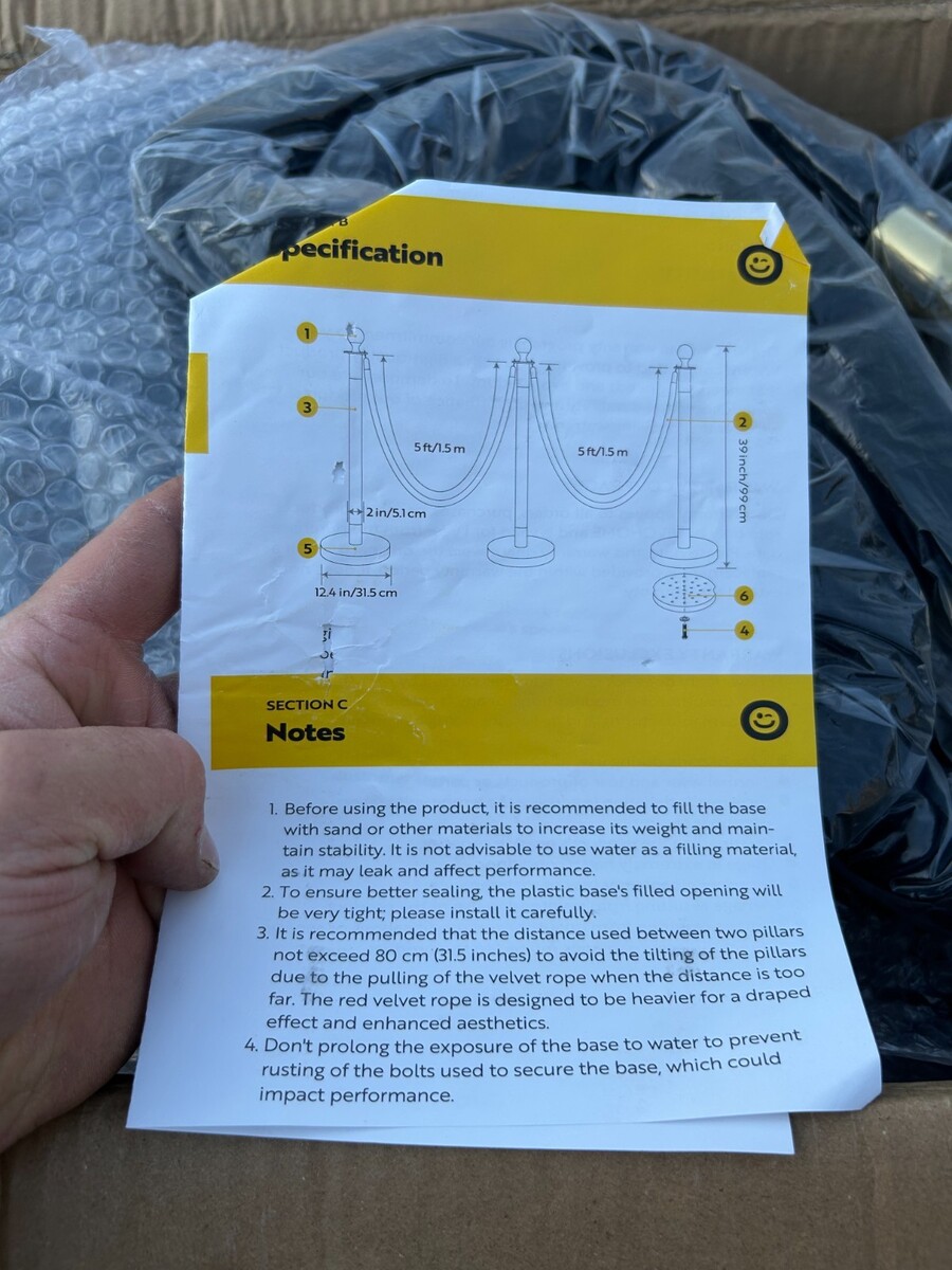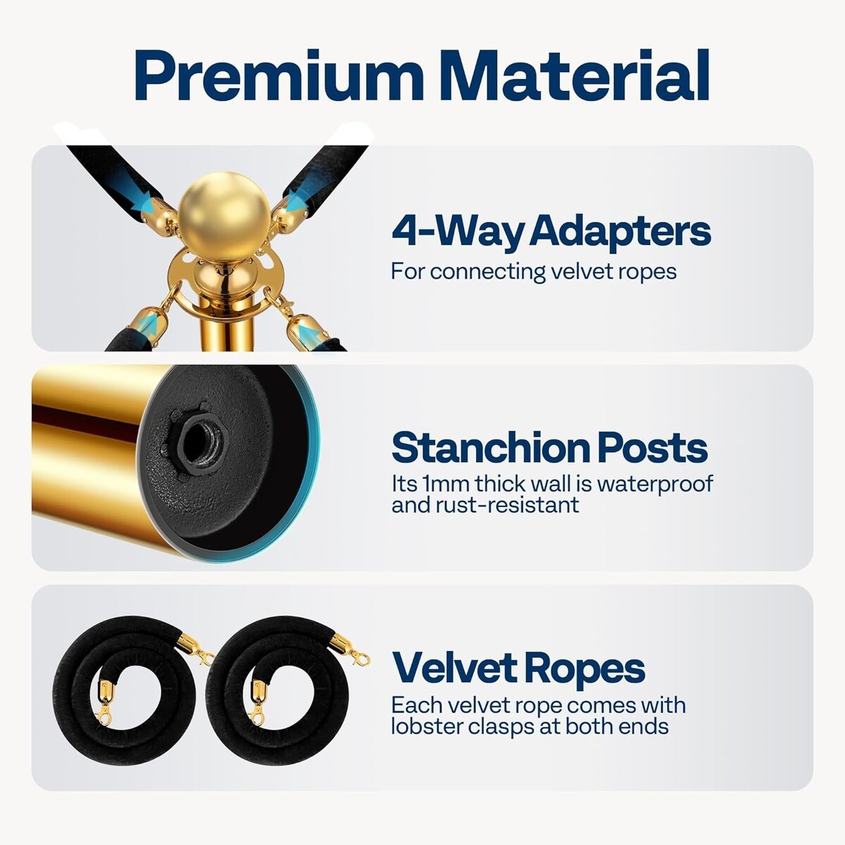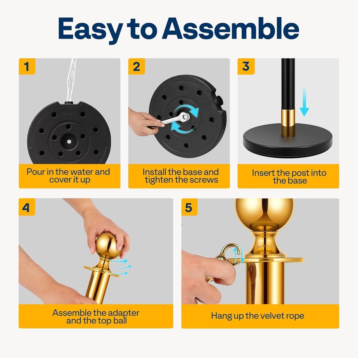 6 Stanchions Iron Post & 5' Velvet Ropes, Black/Gold Fillable Base Decor Barrier