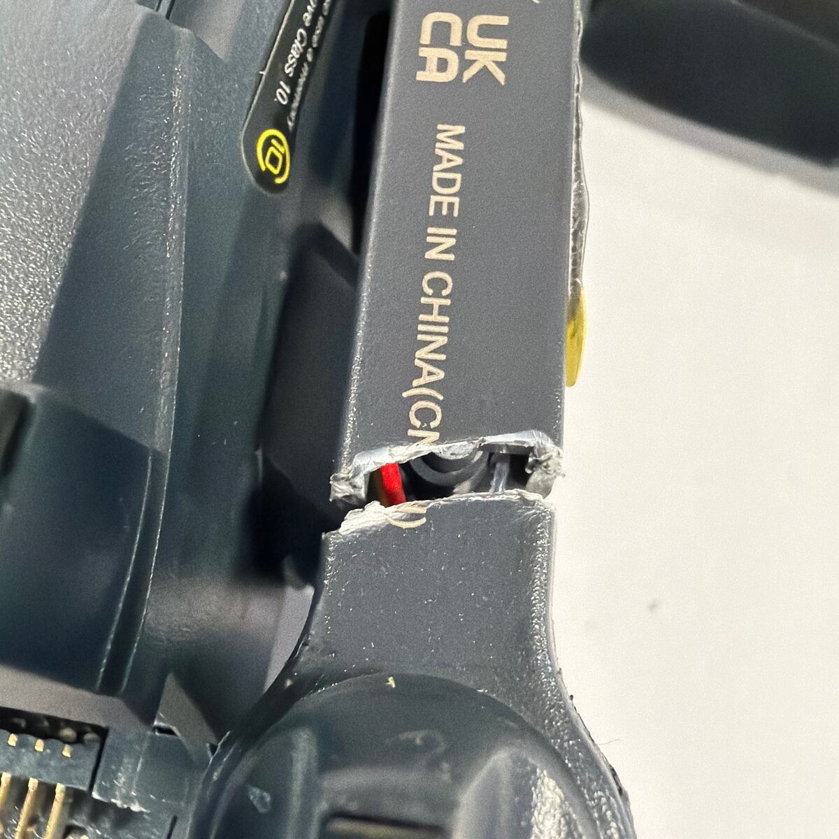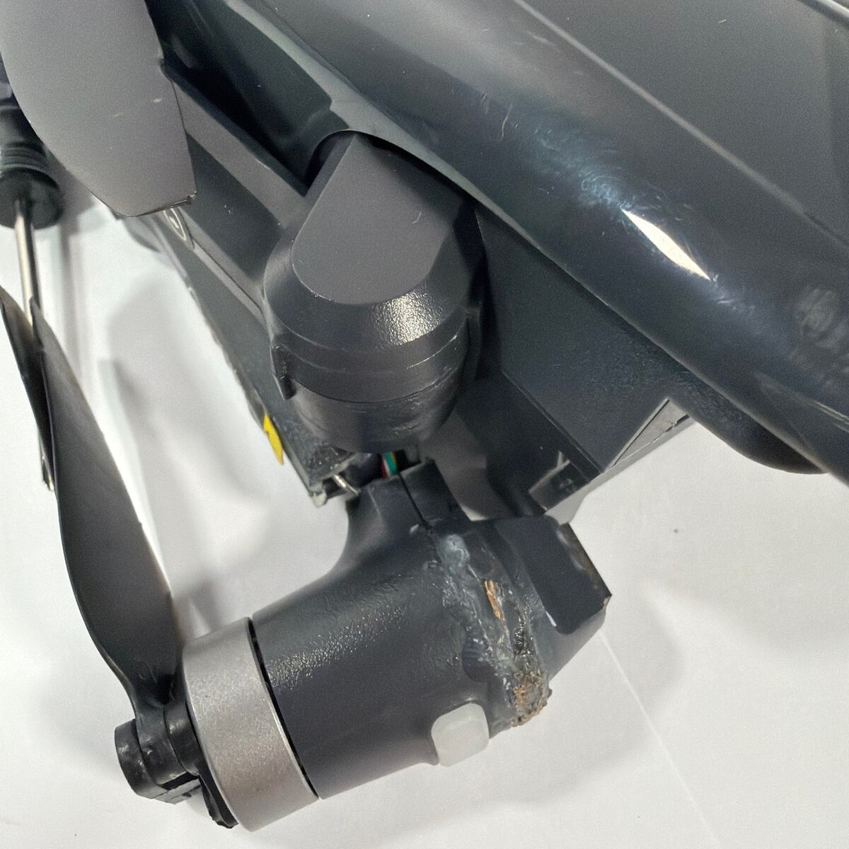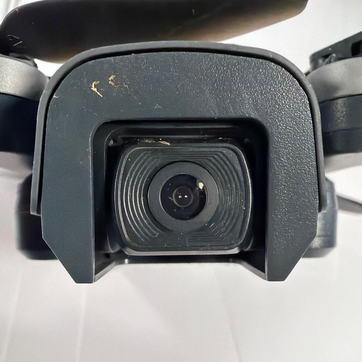 Holy Stone HS710 drone that does not work. The body shows heavy crash damage, including a cracked/broken arm area with exposed internal wiring and scuffs/wear. Sold as-is for parts or repair only. Drone only; no battery, remote/controller, charger, or other accessories are included unless shown in the photos.