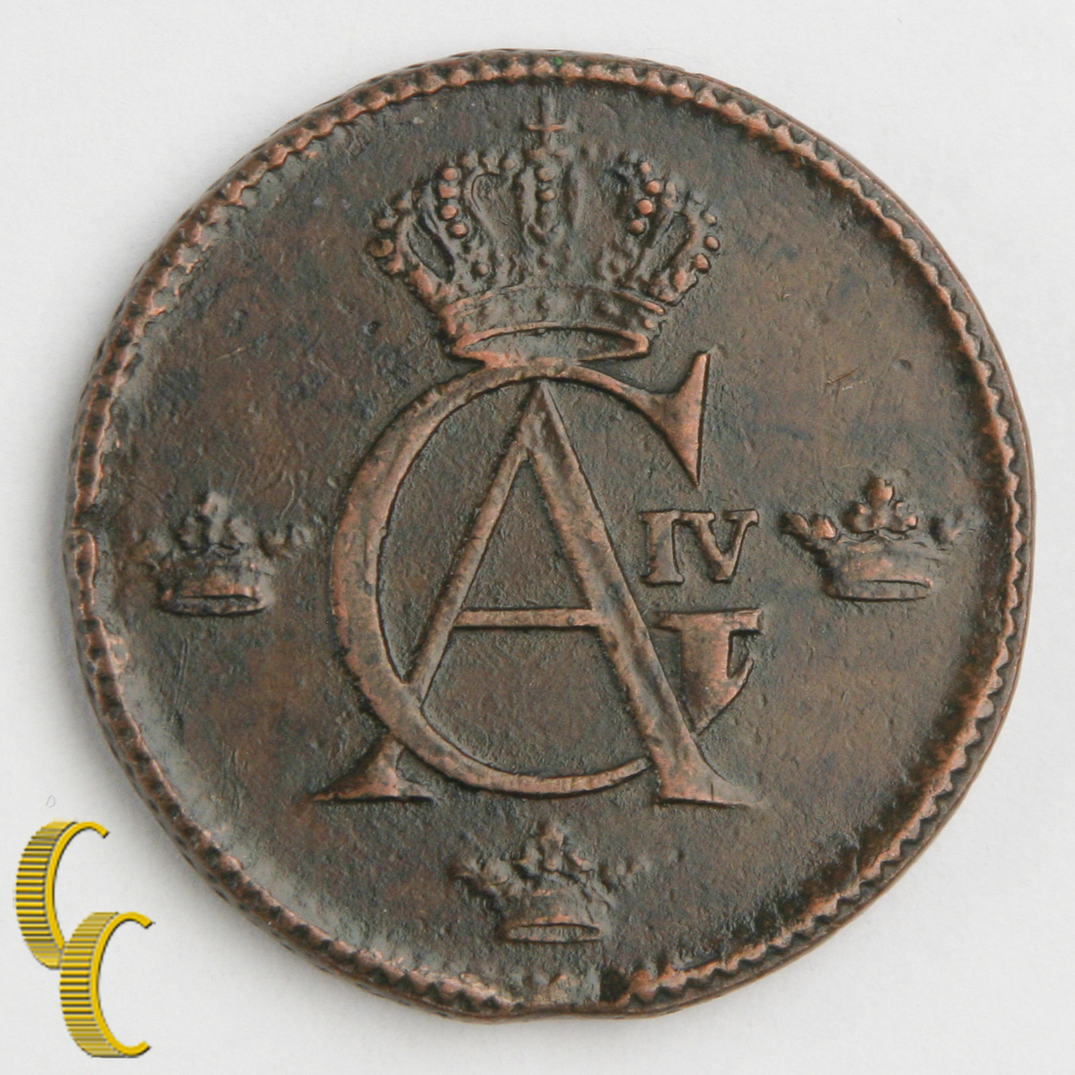 Obverse features a crowned monogram flaked by 3 crowns