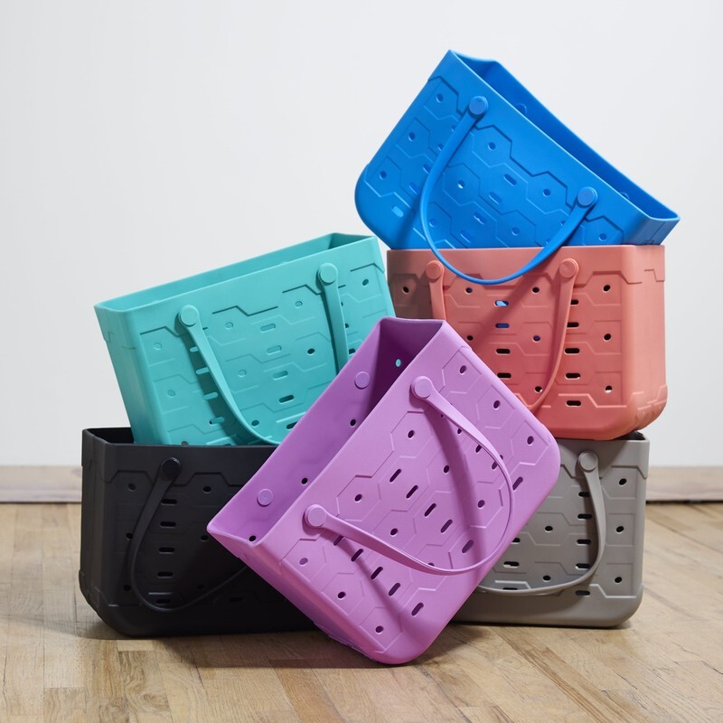 Mainstays Large Plastic Laundry Flex Tote, All Ages Comes in multiple colors Dimensions: 18" W x 13" H x 8.75"D 2 Additional clips included Weight limit is 40 pounds - overpacking can cause warping Made of soft but durable EVA plastic Extreme heat can cause misshaping to occur on the handles. If so, soak in warm water, then re-shape and let cool Plastic liners should be used when carrying sunscreens and lotions, as they could stain totes Two top carrying handles - if handles get twisted, please see our video on how to untwist. Perfect for most age groups Lightweight and easy to carry